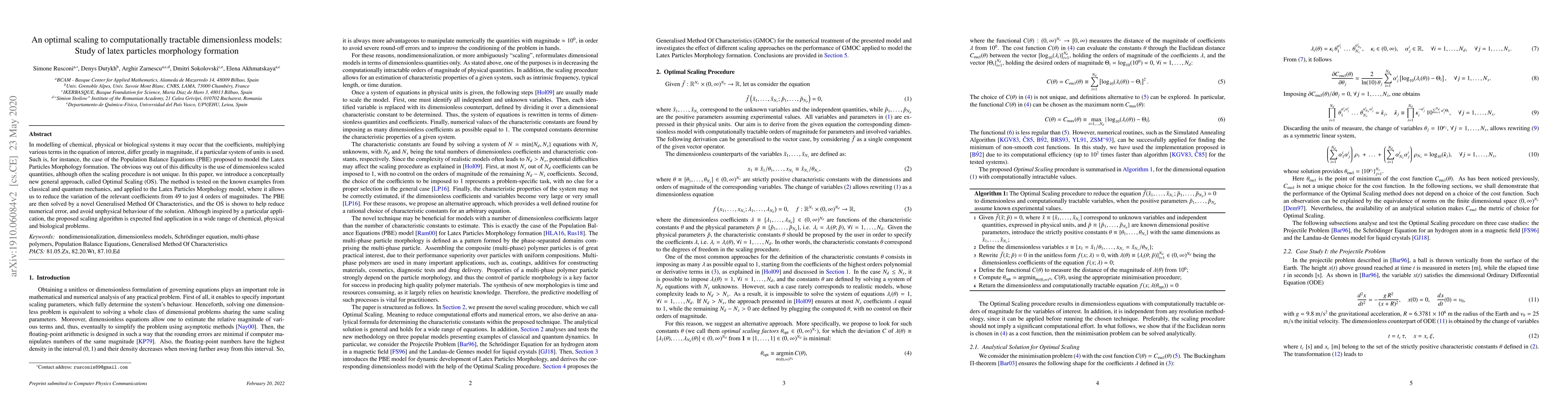 In modelling of chemical, physical or biological systems it may occur that the coefficients, multiplying various terms in the equation of interest, differ greatly in magnitude, if a particular system of units is used. Such is, for instance, the case of the Population Balance Equations (PBE) proposed to model the Latex Particles Morphology formation. The obvious way out of this difficulty is the use of dimensionless scaled quantities, although often the scaling procedure is not unique. In this paper, we introduce a conceptually new general approach, called Optimal Scaling (OS). The method is tested on the known examples from classical and quantum mechanics, and applied to the Latex Particles Morphology model, where it allows us to reduce the variation of the relevant coefficients from 49 to just 4 orders of magnitudes. The PBE are then solved by a novel Generalised Method Of Characteristics, and the OS is shown to help reduce numerical error, and avoid unphysical behaviour of the solution. Although inspired by a particular application, the proposed scaling algorithm is expected find application in a wide range of chemical, physical and biological problems.