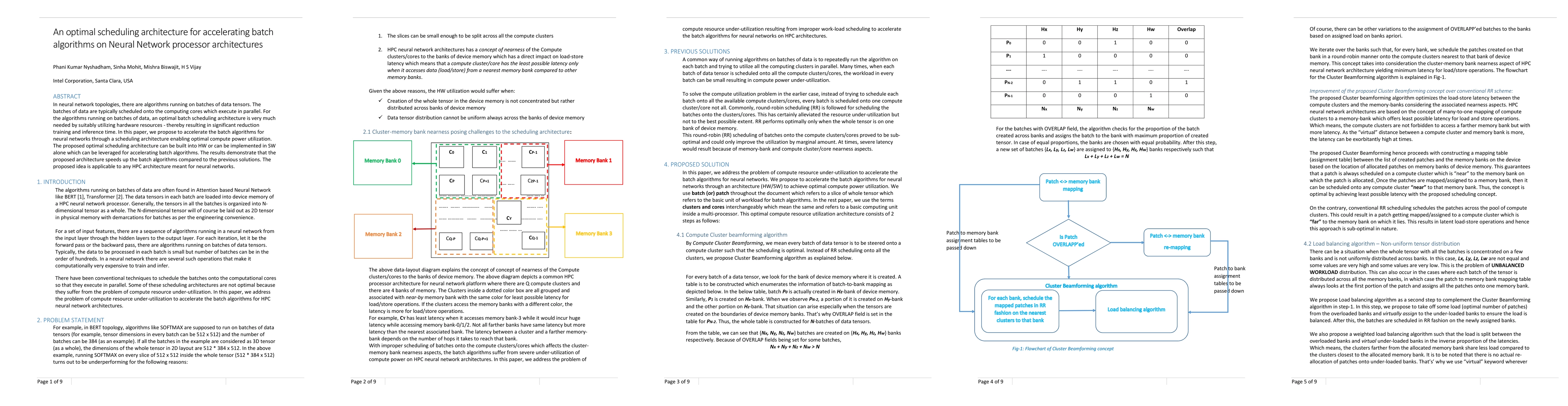 In neural network topologies, algorithms are running on batches of data tensors. The batches of data are typically scheduled onto the computing cores which execute in parallel. For the algorithms running on batches of data, an optimal batch scheduling architecture is very much needed by suitably utilizing hardware resources - thereby resulting in significant reduction training and inference time. In this paper, we propose to accelerate the batch algorithms for neural networks through a scheduling architecture enabling optimal compute power utilization. The proposed optimal scheduling architecture can be built into HW or can be implemented in SW alone which can be leveraged for accelerating batch algorithms. The results demonstrate that the proposed architecture speeds up the batch algorithms compared to the previous solutions. The proposed idea applies to any HPC architecture meant for neural networks.