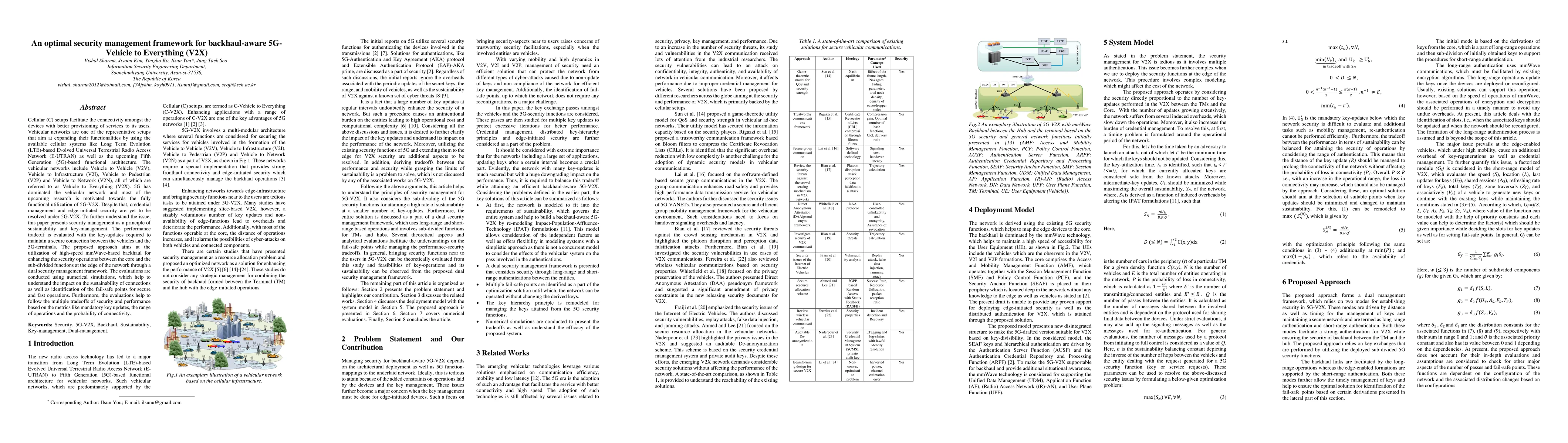 Cellular (C) setups facilitate the connectivity amongst the devices with better provisioning of services to its users. Vehicular networks are one of the representative setups that aim at expanding their functionalities by using the available cellular systems like Long Term Evolution (LTE)-based Evolved Universal Terrestrial Radio Access Network (E-UTRAN) as well as the upcoming Fifth Generation (5G)-based functional architecture. The vehicular networks include Vehicle to Vehicle (V2V), Vehicle to Infrastructure (V2I), Vehicle to Pedestrian (V2P) and Vehicle to Network (V2N), all of which are referred to as Vehicle to Everything (V2X). 5G has dominated the vehicular network and most of the upcoming research is motivated towards the fully functional utilization of 5G-V2X. Despite that, credential management and edge-initiated security are yet to be resolved under 5G-V2X. To further understand the issue, this paper presents security management as a principle of sustainability and key-management. The performance tradeoff is evaluated with the key-updates required to maintain a secure connection between the vehicles and the 5G-terminals. The proposed approach aims at the utilization of high-speed mmWave-based backhaul for enhancing the security operations between the core and the sub-divided functions at the edge of the network through a dual security management framework. The evaluations are conducted using numerical simulations, which help to understand the impact on the sustainability of connections as well as identification of the fail-safe points for secure and fast operations. Furthermore, the evaluations help to follow the multiple tradeoffs of security and performance based on the metrics like mandatory key updates, the range of operations and the probability of connectivity.