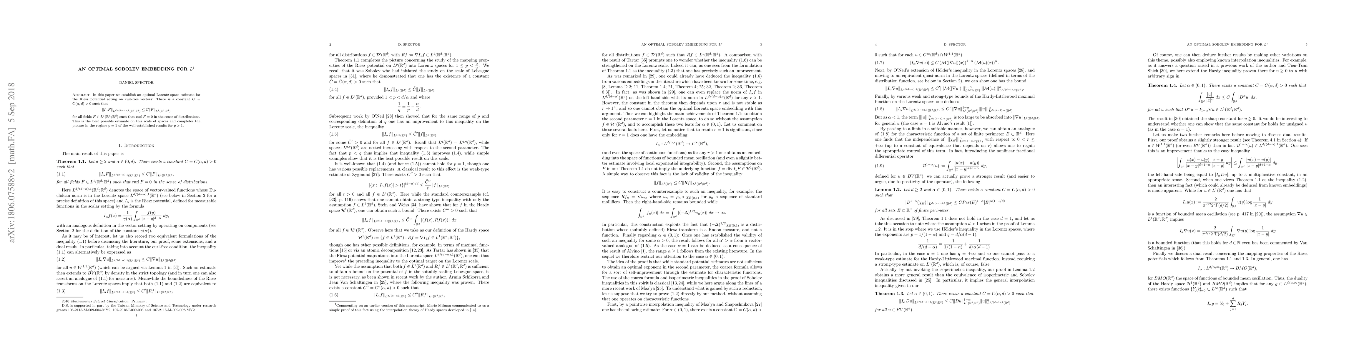 In this paper we establish an optimal Lorentz space estimate for the Riesz potential acting on curl-free vectors: There is a constant $C=C(\alpha,d)>0$ such that \[ \|I_\alpha F \|_{L^{d/(d-\alpha),1}(\mathbb{R}^d;\mathbb{R}^d)} \leq C \|F\|_{L^1(\mathbb{R}^d;\mathbb{R}^d)} \] for all fields $F \in L^1(\mathbb{R}^d;\mathbb{R}^d)$ such that $\operatorname*{curl} F=0$ in the sense of distributions. This is the best possible estimate on this scale of spaces and completes the picture in the regime $p=1$ of the well-established results for $p>1$.