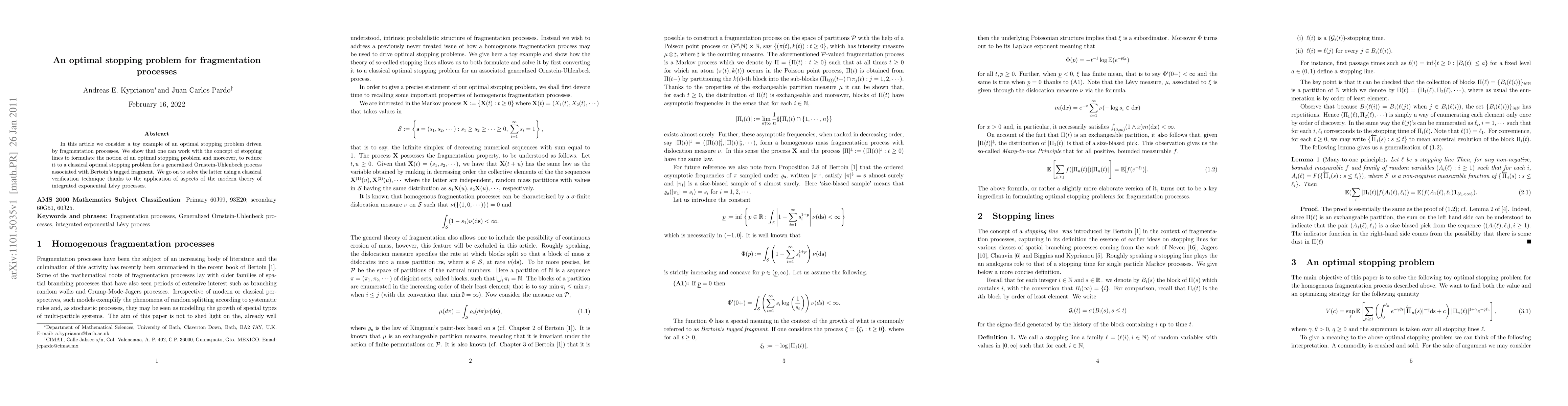 This paper explores an optimal stopping problem within fragmentation processes, utilizing stopping lines to frame the problem and reduce it to a classical optimal stopping problem for a generalized Ornstein-Uhlenbeck process. The solution leverages modern theory of integrated exponential Lévy processes.