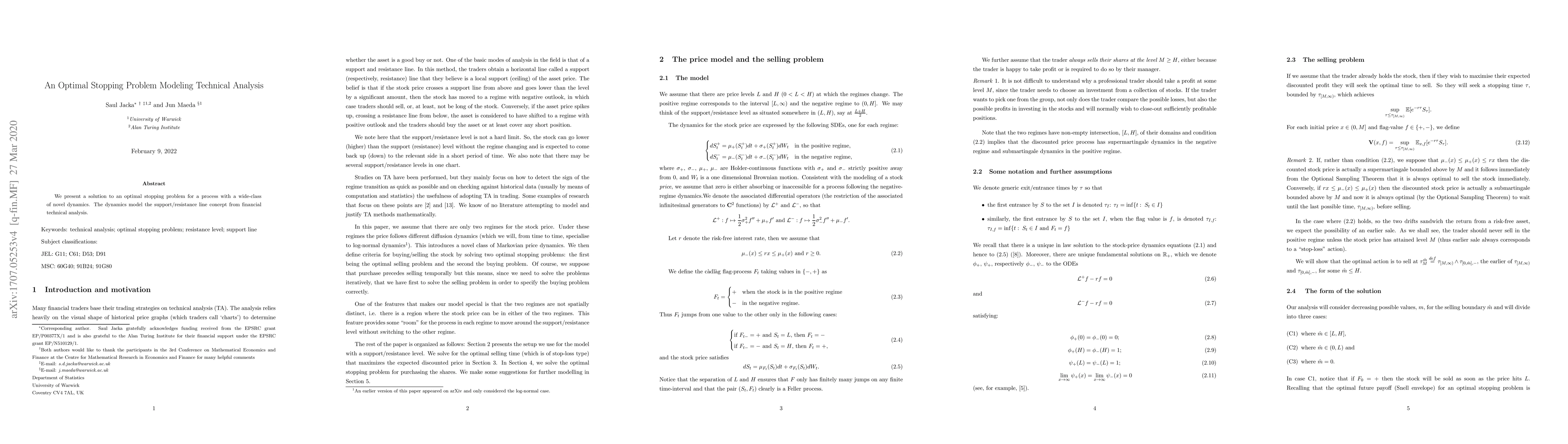 Summary: This paper solves an optimal stopping problem for a process that models the support/resistance lines from technical analysis, providing a novel framework for understanding financial market dynamics. The approach offers a mathematical foundation for trading strategies based on these concepts.
