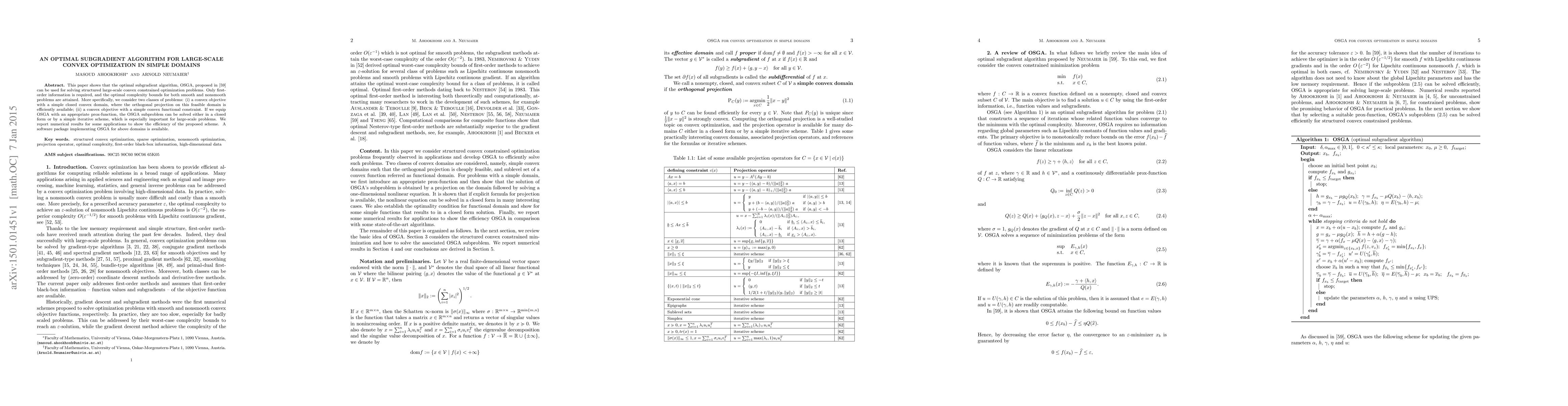 This paper presents an optimal subgradient algorithm for solving large-scale convex optimization problems with minimal first-order information, achieving optimal complexity bounds for both smooth and nonsmooth cases.