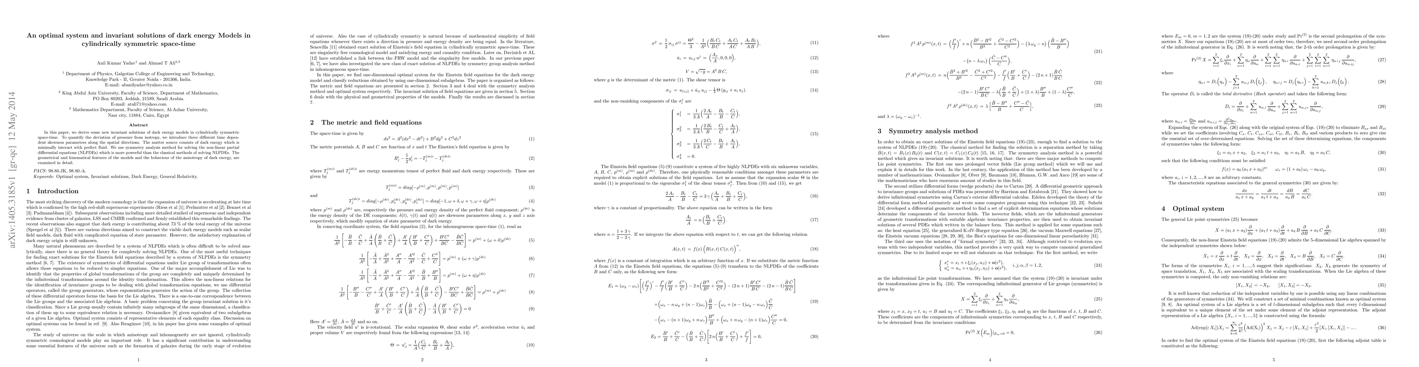 In this paper, we derive some new invariant solutions of dark energy models in cylindrically symmetric space-time. To quantify the deviation of pressure from isotropy, we introduce three different time dependent skewness parameters along the spatial directions. The matter source consists of dark energy which is minimally interact with perfect fluid. We use symmetry analysis method for solving the non-linear partial differential equations (NLPDEs) which is more powerful than the classical methods of solving NLPDEs. The geometrical and kinematical features of the models and the behaviour of the anisotropy of dark energy, are examined in detail.