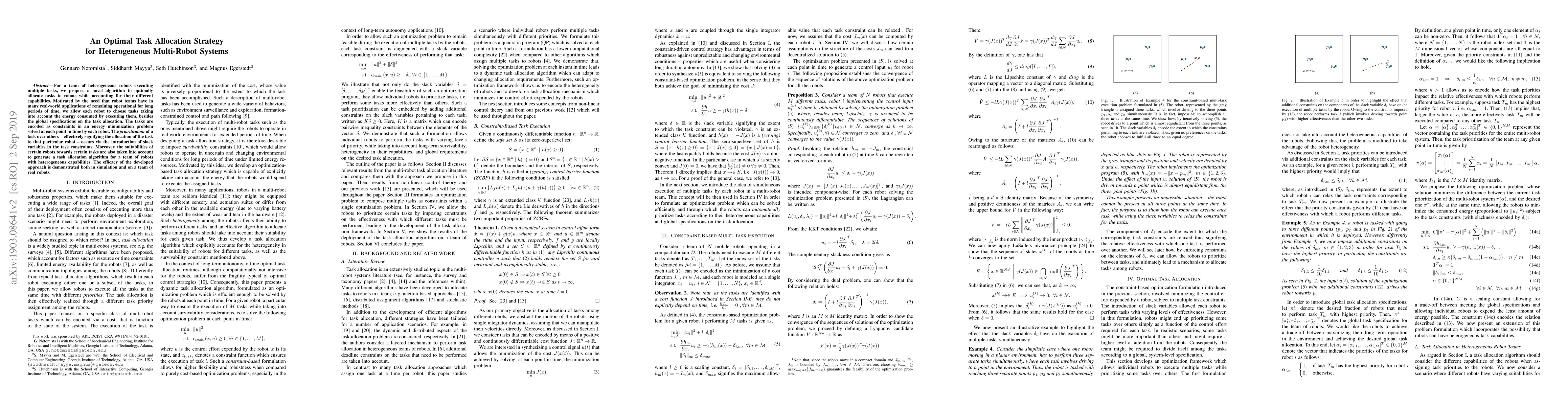 This paper proposes a novel algorithm for optimally allocating tasks to heterogeneous multi-robot systems, balancing energy consumption and task suitability. The approach is validated through both simulation and real-world robot experiments.