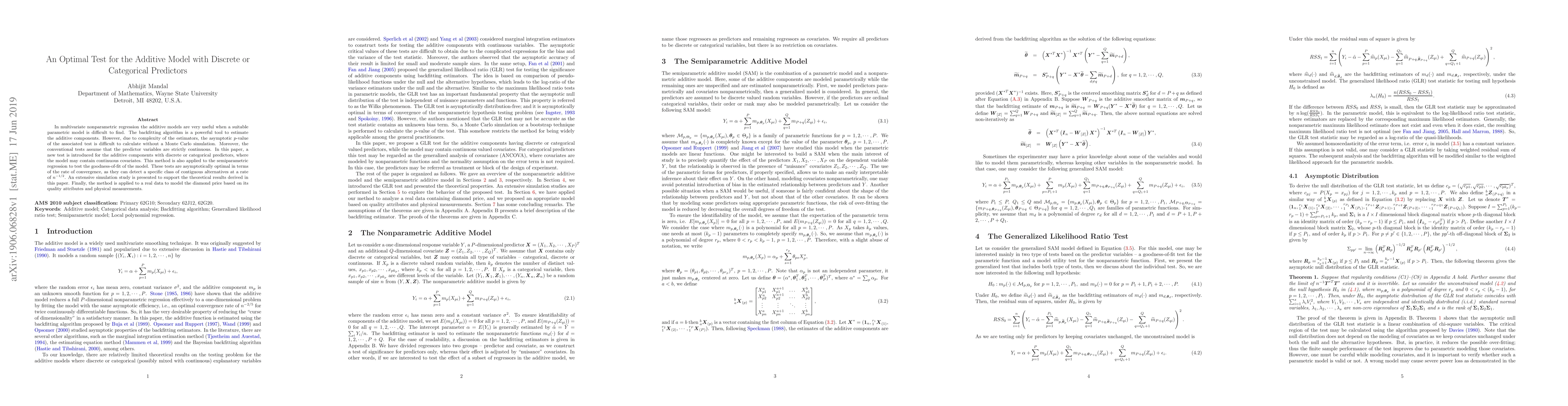 In multivariate nonparametric regression the additive models are very useful when a suitable parametric model is difficult to find. The backfitting algorithm is a powerful tool to estimate the additive components. However, due to complexity of the estimators, the asymptotic $p$-value of the associated test is difficult to calculate without a Monte Carlo simulation. Moreover, the conventional tests assume that the predictor variables are strictly continuous. In this paper, a new test is introduced for the additive components with discrete or categorical predictors, where the model may contain continuous covariates. This method is also applied to the semiparametric regression to test the goodness-of-fit of the model. These tests are asymptotically optimal in terms of the rate of convergence, as they can detect a specific class of contiguous alternatives at a rate of $n^{-1/2}$. An extensive simulation study is presented to support the theoretical results derived in this paper. Finally, the method is applied to a real data to model the diamond price based on its quality attributes and physical measurements.