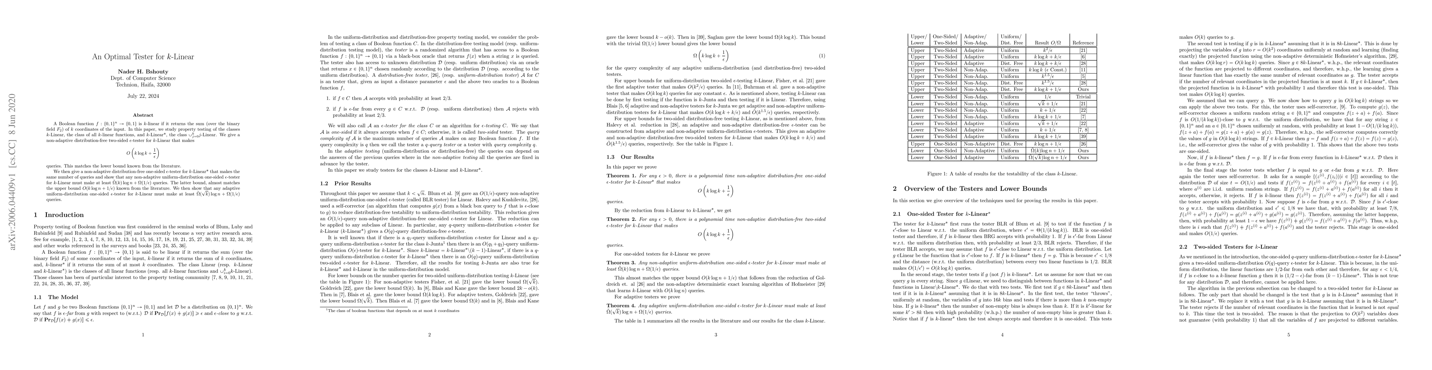 A Boolean function $f:\{0,1\}^n\to \{0,1\}$ is $k$-linear if it returns the sum (over the binary field $F_2$) of $k$ coordinates of the input. In this paper, we study property testing of the classes $k$-Linear, the class of all $k$-linear functions, and $k$-Linear$^*$, the class $\cup_{j=0}^kj$-Linear. We give a non-adaptive distribution-free two-sided $\epsilon$-tester for $k$-Linear that makes $$O\left(k\log k+\frac{1}{\epsilon}\right)$$ queries. This matches the lower bound known from the literature. We then give a non-adaptive distribution-free one-sided $\epsilon$-tester for $k$-Linear$^*$ that makes the same number of queries and show that any non-adaptive uniform-distribution one-sided $\epsilon$-tester for $k$-Linear must make at least $ \tilde\Omega(k)\log n+\Omega(1/\epsilon)$ queries. The latter bound, almost matches the upper bound $O(k\log n+1/\epsilon)$ known from the literature. We then show that any adaptive uniform-distribution one-sided $\epsilon$-tester for $k$-Linear must make at least $\tilde\Omega(\sqrt{k})\log n+\Omega(1/\epsilon)$ queries.