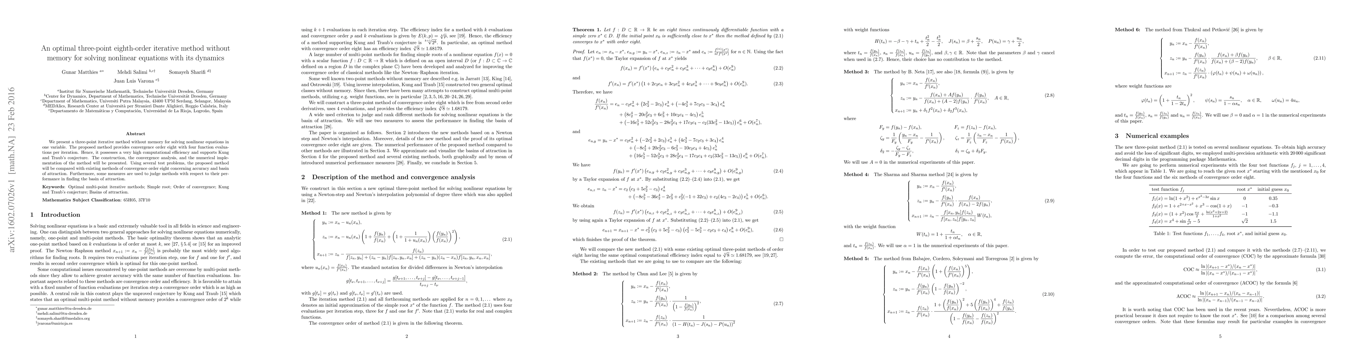 We present a three-point iterative method without memory for solving nonlinear equations in one variable. The proposed method provides convergence order eight with four function evaluations per iteration. Hence, it possesses a very high computational efficiency and supports Kung and Traub's conjecture. The construction, the convergence analysis, and the numerical implementation of the method will be presented. Using several test problems, the proposed method will be compared with existing methods of convergence order eight concerning accuracy and basin of attraction. Furthermore, some measures are used to judge methods with respect to their performance in finding the basin of attraction.