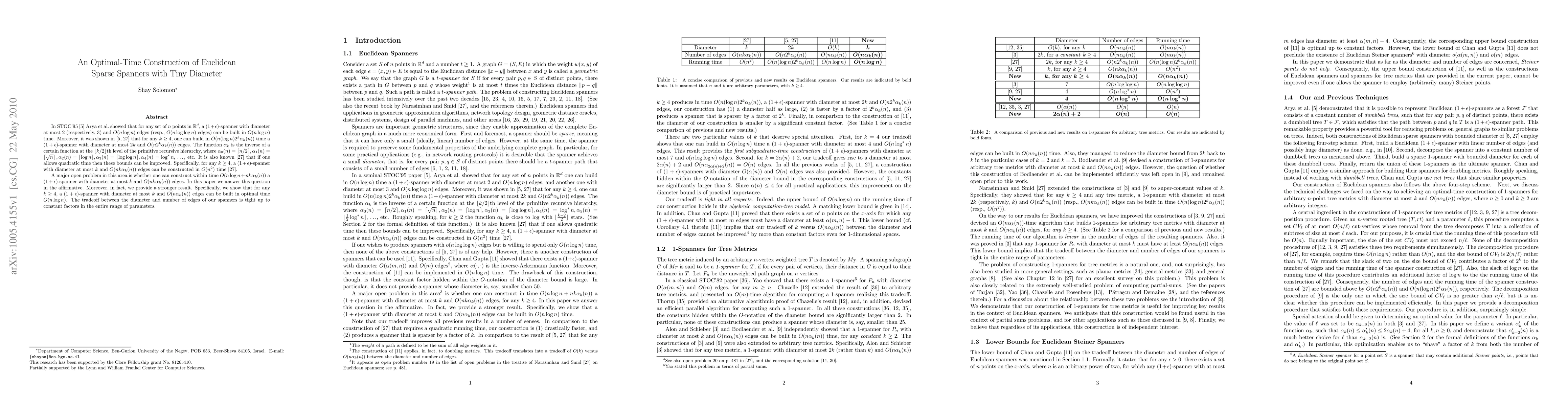 In STOC'95 \cite{ADMSS95} Arya et al.\ showed that for any set of $n$ points in $\mathbb R^d$, a $(1+\epsilon)$-spanner with diameter at most 2 (respectively, 3) and $O(n \log n)$ edges (resp., $O(n \log \log n)$ edges) can be built in $O(n \log n)$ time. Moreover, it was shown in \cite{ADMSS95,NS07} that for any $k \ge 4$, one can build in $O(n (\log n) 2^k \alpha_k(n))$ time a $(1+\epsilon)$-spanner with diameter at most $2k$ and $O(n 2^k \alpha_k(n))$ edges. The function $\alpha_k$ is the inverse of a certain function at the $\lfloor k/2 \rfloor$th level of the primitive recursive hierarchy, where $\alpha_0(n) = \lceil n/2 \rceil, \alpha_1(n) = \left\lceil \sqrt{n} \right\rceil, \alpha_2(n) = \lceil \log{n} \rceil, \alpha_3(n) = \lceil \log\log{n} \rceil, \alpha_4(n) = \log^* n$, \ldots, etc. It is also known \cite{NS07} that if one allows quadratic time then these bounds can be improved. Specifically, for any $k \ge 4$, a $(1+\epsilon)$-spanner with diameter at most $k$ and $O(n k \alpha_k(n))$ edges can be constructed in $O(n^2)$ time \cite{NS07}. A major open problem in this area is whether one can construct within time $O(n \log n + n k \alpha_k(n))$ a $(1+\epsilon)$-spanner with diameter at most $k$ and $O(n k \alpha_k(n))$ edges. In this paper we answer this question in the affirmative. Moreover, in fact, we provide a stronger result. Specifically, we show that for any $k \ge 4$, a $(1+\epsilon)$-spanner with diameter at most $k$ and $O(n \alpha_k(n))$ edges can be built in optimal time $O(n \log n)$. The tradeoff between the diameter and number of edges of our spanners is tight up to constant factors in the entire range of parameters.