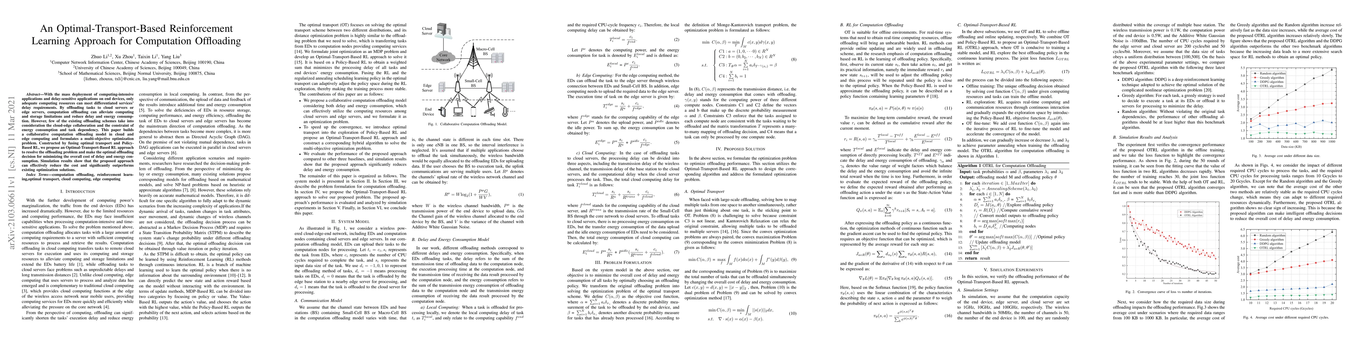 This paper proposes an Optimal-Transport-Based Reinforcement Learning approach for computation offloading to minimize delay and energy consumption. It integrates optimal transport and Policy-Based RL to address cloud-edge collaboration and task dependency, outperforming existing methods in simulations.