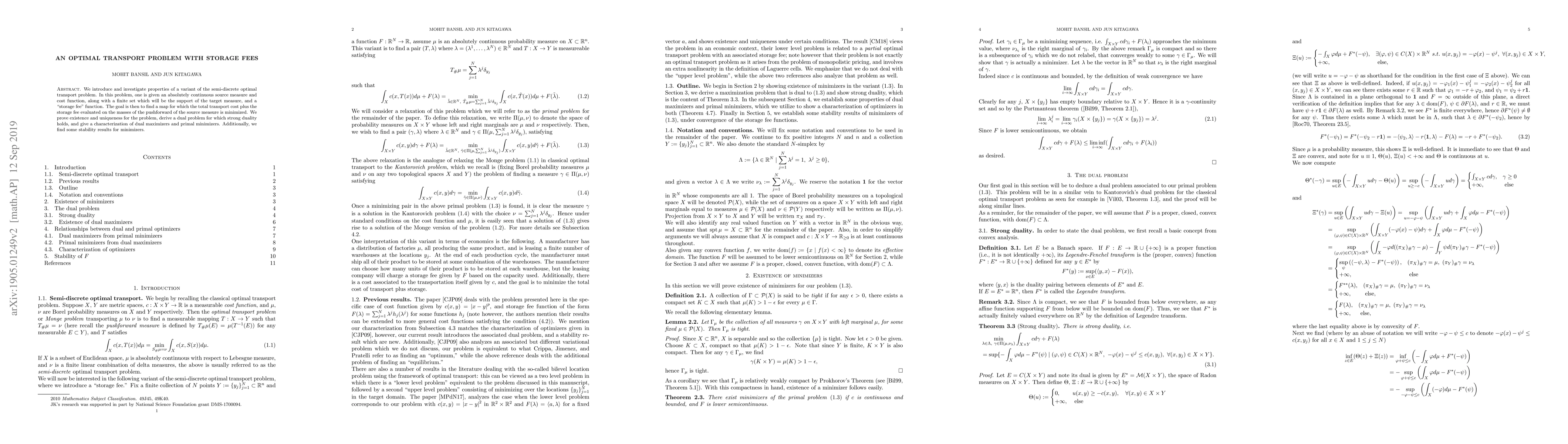 This paper explores a variant of the optimal transport problem incorporating storage fees, proving existence and uniqueness of solutions, deriving a dual problem with strong duality, and characterizing both dual maximizers and primal minimizers. Stability results for minimizers are also presented.