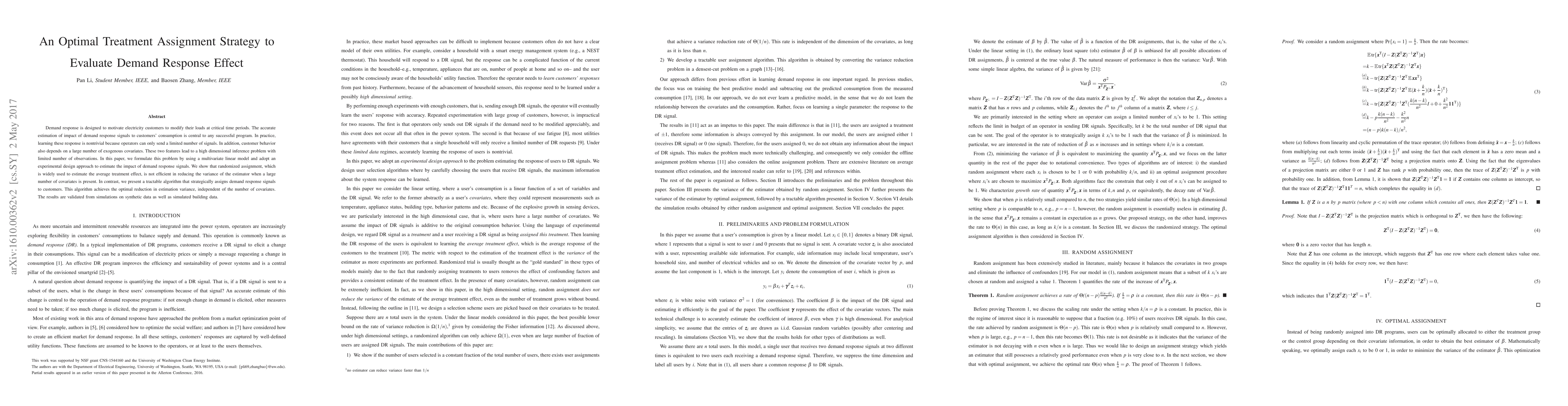 This paper proposes an optimal treatment assignment strategy to accurately estimate the demand response effect amidst high dimensionality and limited signals. Unlike randomized assignment, the new algorithm strategically assigns signals to reduce estimation variance, validated through simulations on synthetic data.