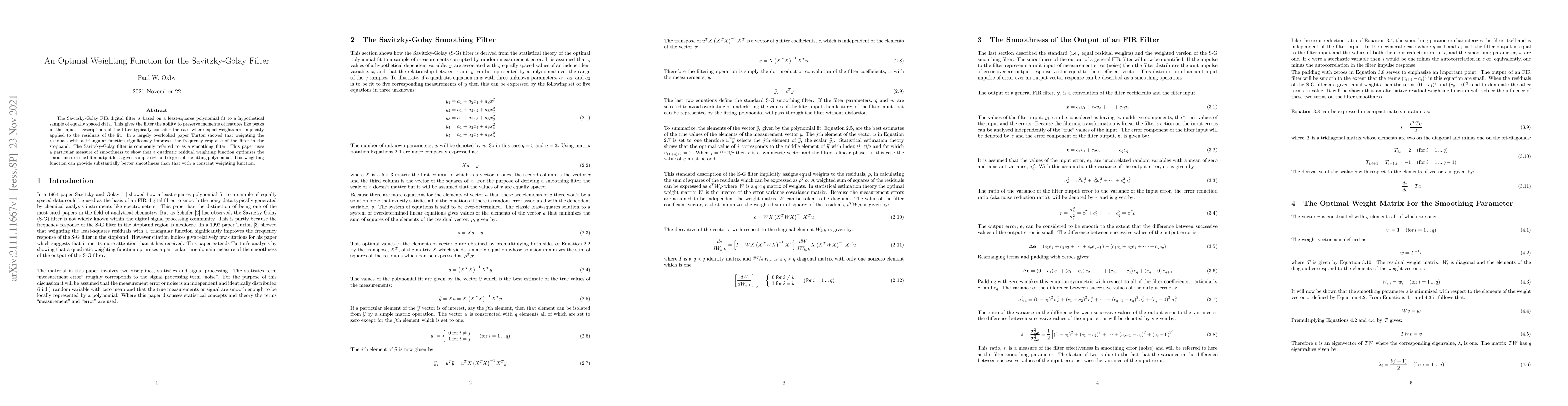 This paper investigates optimal weighting functions for the Savitzky-Golay filter, demonstrating that a quadratic residual weighting function significantly enhances the filter's smoothness compared to a constant weighting function, thereby improving the frequency response in the stopband.