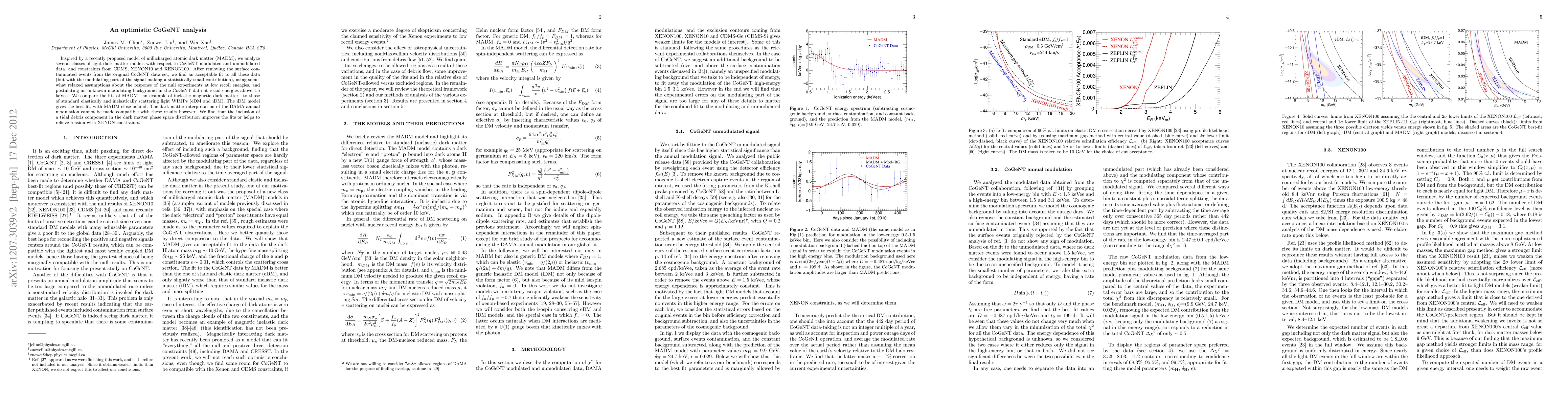 Inspired by a recently proposed model of millicharged atomic dark matter (MADM), we analyze several classes of light dark matter models with respect to CoGeNT modulated and unmodulated data, and constraints from CDMS, XENON10 and XENON100. After removing the surface contaminated events from the original CoGeNT data set, we find an acceptable fit to all these data (but with the modulating part of the signal making a statistically small contribution), using somewhat relaxed assumptions about the response of the null experiments at low recoil energies, and postulating an unknown modulating background in the CoGeNT data at recoil energies above 1.5 keVee. We compare the fits of MADM---an example of inelastic magnetic dark matter---to those of standard elastically and inelastically scattering light WIMPs (eDM and iDM). The iDM model gives the best fit, with MADM close behind. The dark matter interpretation of the DAMA annual modulation cannot be made compatible with these results however. We find that the inclusion of a tidal debris component in the dark matter phase space distribution improves the fits or helps to relieve tension with XENON constraints.