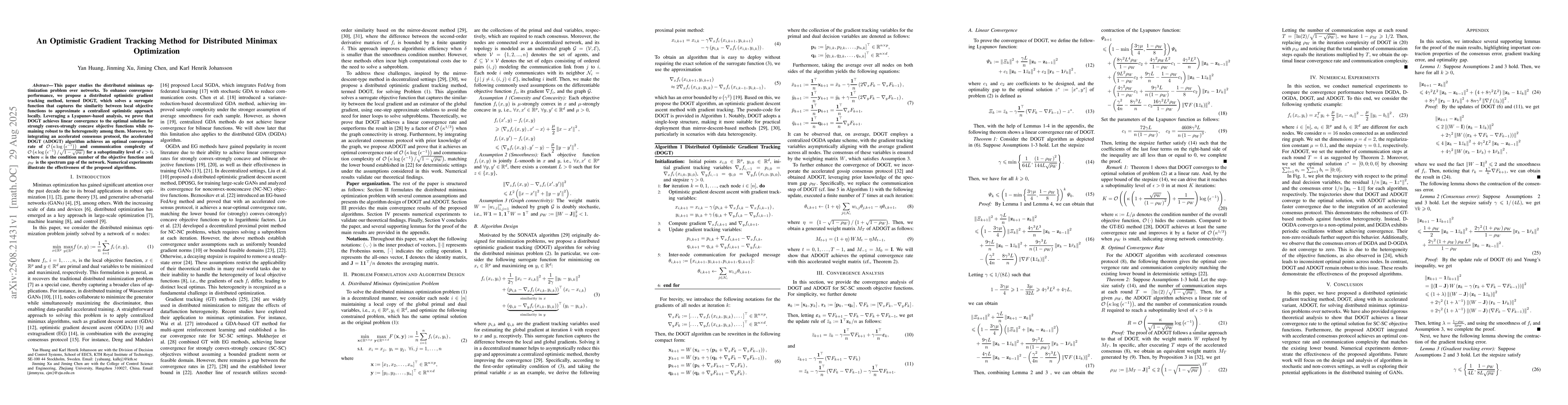 This paper studies the distributed minimax optimization problem over networks. To enhance convergence performance, we propose a distributed optimistic gradient tracking method, termed DOGT, which solves a surrogate function that captures the similarity between local objective functions to approximate a centralized optimistic approach locally. Leveraging a Lyapunov-based analysis, we prove that DOGT achieves linear convergence to the optimal solution for strongly convex-strongly concave objective functions while remaining robust to the heterogeneity among them. Moreover, by integrating an accelerated consensus protocol, the accelerated DOGT (ADOGT) algorithm achieves an optimal convergence rate of $\mathcal{O} \left( \kappa \log \left( \epsilon ^{-1} \right) \right)$ and communication complexity of $\mathcal{O} \left( \kappa \log \left( \epsilon ^{-1} \right) /\sqrt{1-\sqrt{\rho _W}} \right)$ for a suboptimality level of $\epsilon>0$, where $\kappa$ is the condition number of the objective function and $\rho_W$ is the spectrum gap of the network. Numerical experiments illustrate the effectiveness of the proposed algorithms.