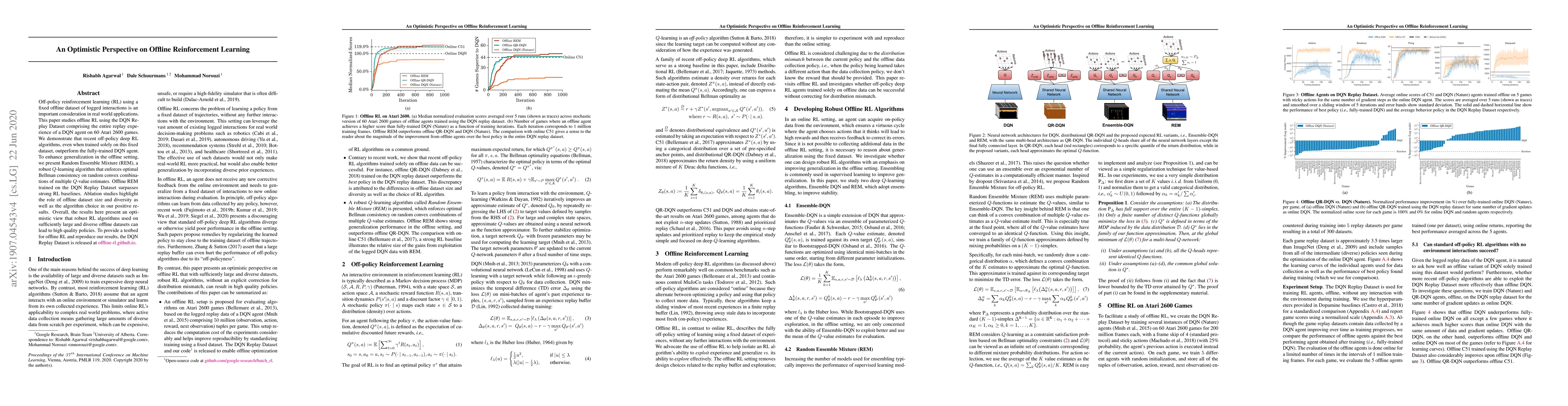 Off-policy reinforcement learning (RL) using a fixed offline dataset of logged interactions is an important consideration in real world applications. This paper studies offline RL using the DQN replay dataset comprising the entire replay experience of a DQN agent on 60 Atari 2600 games. We demonstrate that recent off-policy deep RL algorithms, even when trained solely on this fixed dataset, outperform the fully trained DQN agent. To enhance generalization in the offline setting, we present Random Ensemble Mixture (REM), a robust Q-learning algorithm that enforces optimal Bellman consistency on random convex combinations of multiple Q-value estimates. Offline REM trained on the DQN replay dataset surpasses strong RL baselines. Ablation studies highlight the role of offline dataset size and diversity as well as the algorithm choice in our positive results. Overall, the results here present an optimistic view that robust RL algorithms trained on sufficiently large and diverse offline datasets can lead to high quality policies. The DQN replay dataset can serve as an offline RL benchmark and is open-sourced.