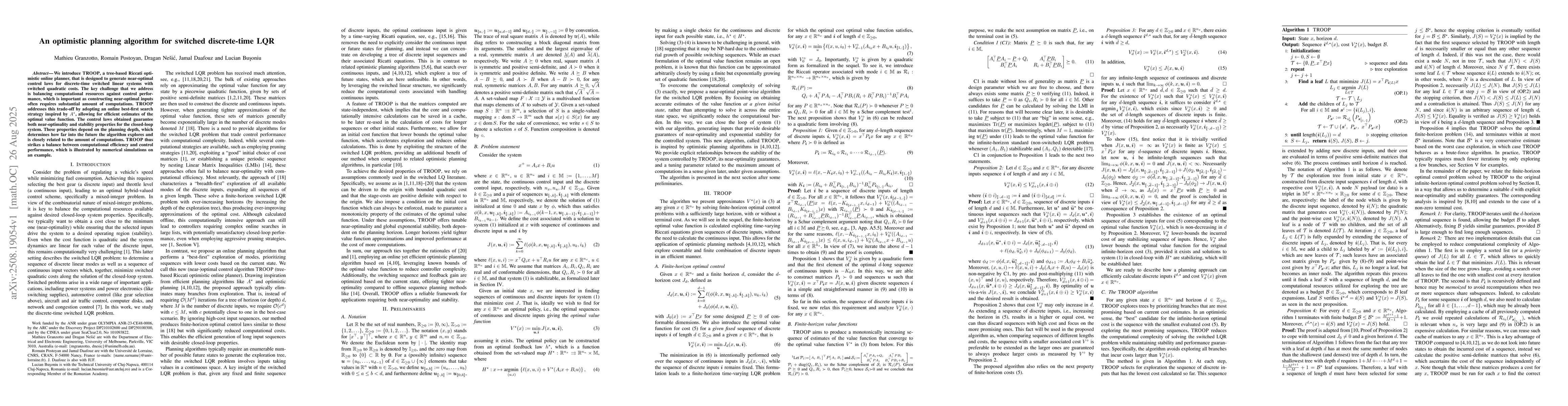 We introduce TROOP, a tree-based Riccati optimistic online planner, that is designed to generate near-optimal control laws for discrete-time switched linear systems with switched quadratic costs. The key challenge that we address is balancing computational resources against control performance, which is important as constructing near-optimal inputs often requires substantial amount of computations. TROOP addresses this trade-off by adopting an online best-first search strategy inspired by A*, allowing for efficient estimates of the optimal value function. The control laws obtained guarantee both near-optimality and stability properties for the closed-loop system. These properties depend on the planning depth, which determines how far into the future the algorithm explores and is closely related to the amount of computations. TROOP thus strikes a balance between computational efficiency and control performance, which is illustrated by numerical simulations on an example.