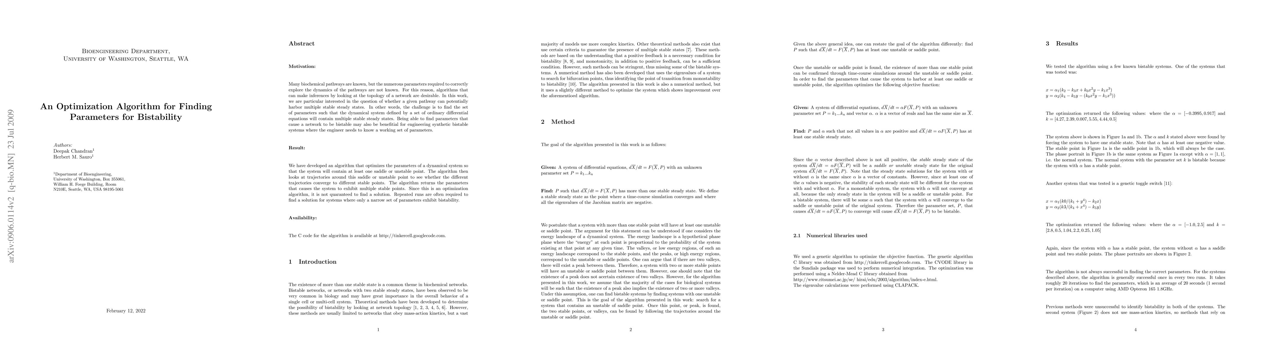 Motivation: Many biochemical pathways are known, but the numerous parameters required to correctly explore the dynamics of the pathways are not known. For this reason, algorithms that can make inferences by looking at the topology of a network are desirable. In this work, we are particular interested in the question of whether a given pathway can potentially harbor multiple stable steady states. In other words, the challenge is to find the set of parameters such that the dynamical system defined by a set of ordinary differential equations will contain multiple stable steady states. Being able to find parameters that cause a network to be bistable may also be benefitial for engineering synthetic bistable systems where the engineer needs to know a working set of parameters. Result: We have developed an algorithm that optimizes the parameters of a dynamical system so that the system will contain at least one saddle or unstable point. The algorithm then looks at trajectories around this saddle or unstable point to see whether the different trajectories converge to different stable points. The algorithm returns the parameters that causes the system to exhibit multiple stable points. Since this is an optimization algorithm, it is not quaranteed to find a solution. Repeated runs are often required to find a solution for systems where only a narrow set of parameters exhibit bistability. Availability: The C code for the algorithm is available at http://tinkercell.googlecode.com