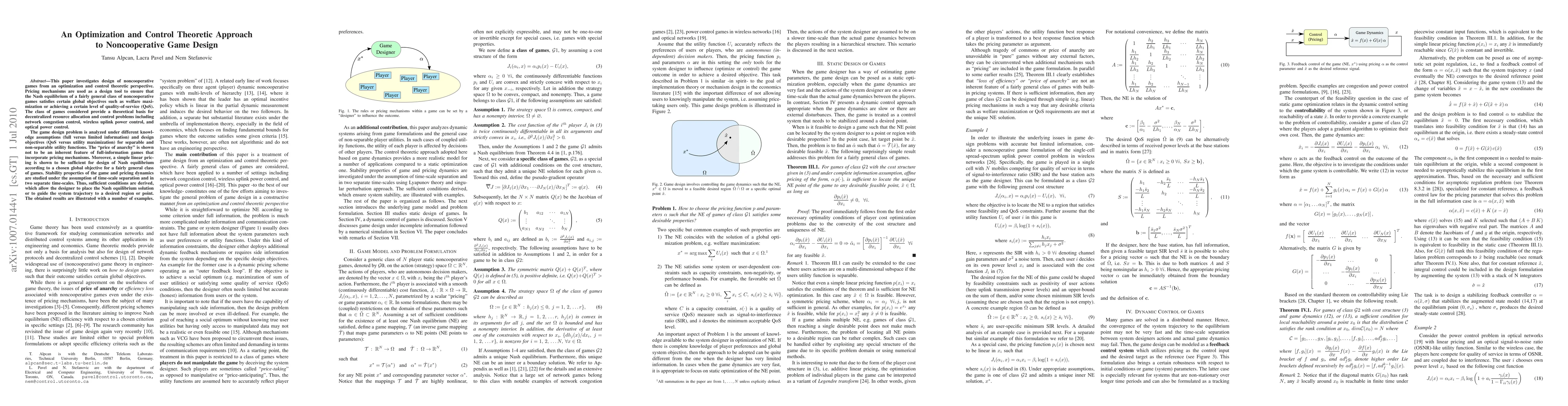This paper explores the design of noncooperative games using optimization and control theory, employing pricing mechanisms to achieve global objectives like welfare maximization or QoS. It demonstrates that linear pricing can effectively guide Nash equilibrium under various knowledge and design assumptions, and provides stability conditions for game dynamics.