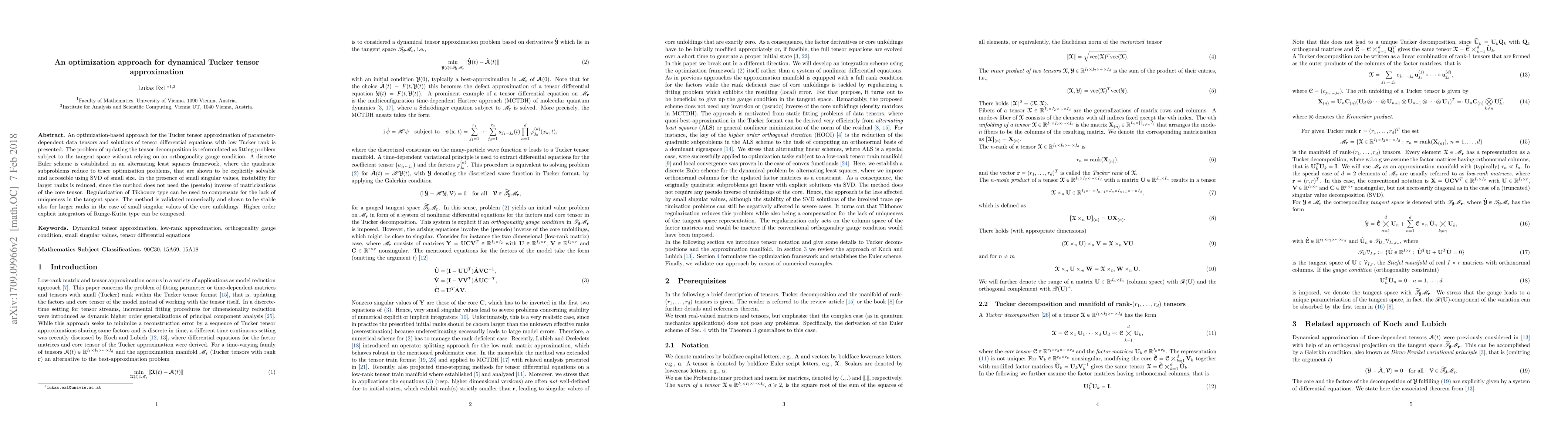 This paper presents an optimization-based approach for Tucker tensor approximation, reformulating the problem as a fitting issue without an orthogonality gauge. It uses an alternating least squares framework with a discrete Euler scheme, showing stability and explicit solvability via SVD, and regularizes to handle lack of uniqueness.