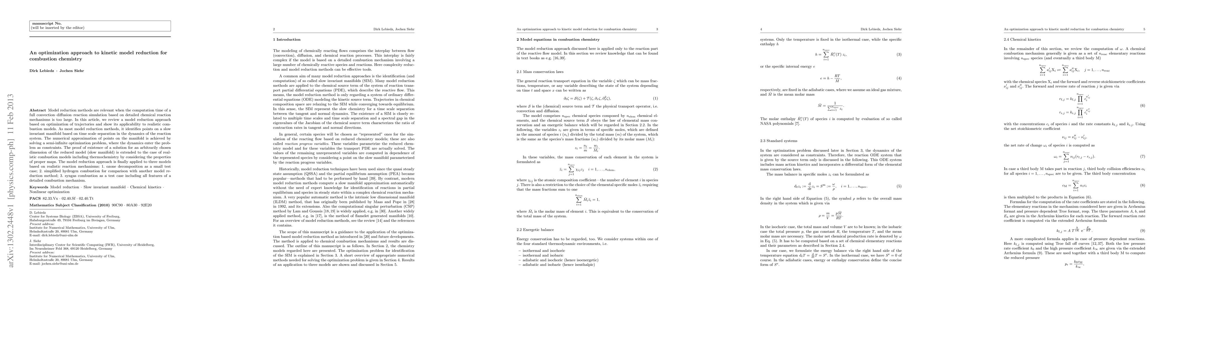 This paper reviews an optimization-based approach to reduce kinetic models for combustion chemistry, demonstrating its application to realistic combustion models through three test cases: ozone decomposition, simplified hydrogen combustion, and syngas combustion. The method identifies points on a slow invariant manifold by solving a semi-infinite optimization problem, ensuring the existence of a solution for reduced model dimensions.