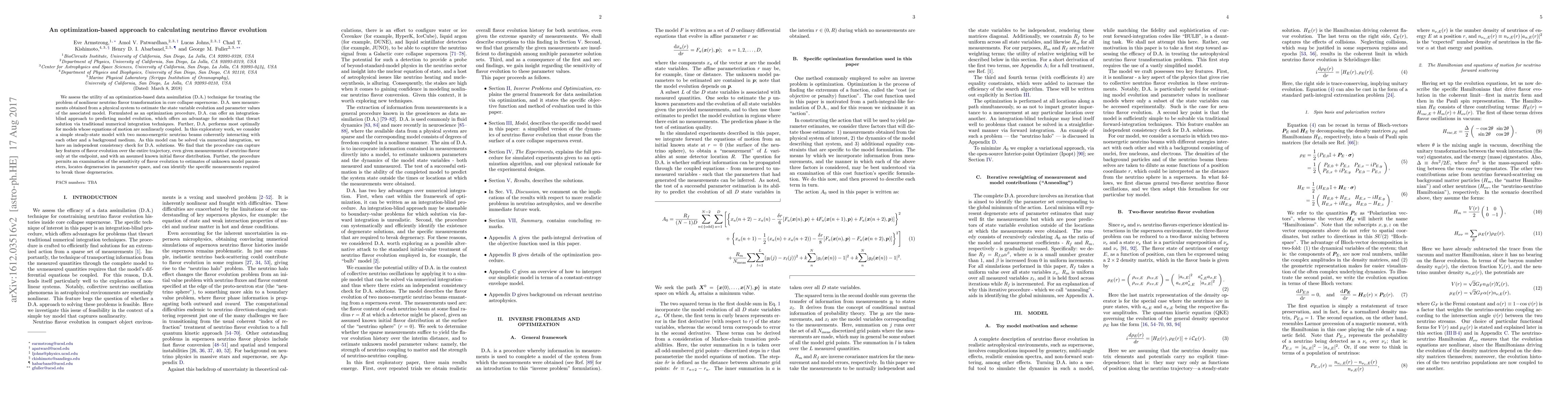 We assess the utility of an optimization-based data assimilation (D.A.) technique for treating the problem of nonlinear neutrino flavor transformation in core collapse supernovae. D.A. uses measurements obtained from a physical system to estimate the state variable evolution and parameter values of the associated model. Formulated as an optimization procedure, D.A. can offer an integration-blind approach to predicting model evolution, which offers an advantage for models that thwart solution via traditional numerical integration techniques. Further, D.A. performs most optimally for models whose equations of motion are nonlinearly coupled. In this exploratory work, we consider a simple steady-state model with two mono-energetic neutrino beams coherently interacting with each other and a background medium. As this model can be solved via numerical integration, we have an independent consistency check for D.A. solutions. We find that the procedure can capture key features of flavor evolution over the entire trajectory, even given measurements of neutrino flavor only at the endpoint, and with an assumed known initial flavor distribution. Further, the procedure permits an examination of the sensitivity of flavor evolution to estimates of unknown model parameters, locates degeneracies in parameter space, and can identify the specific measurements required to break those degeneracies.