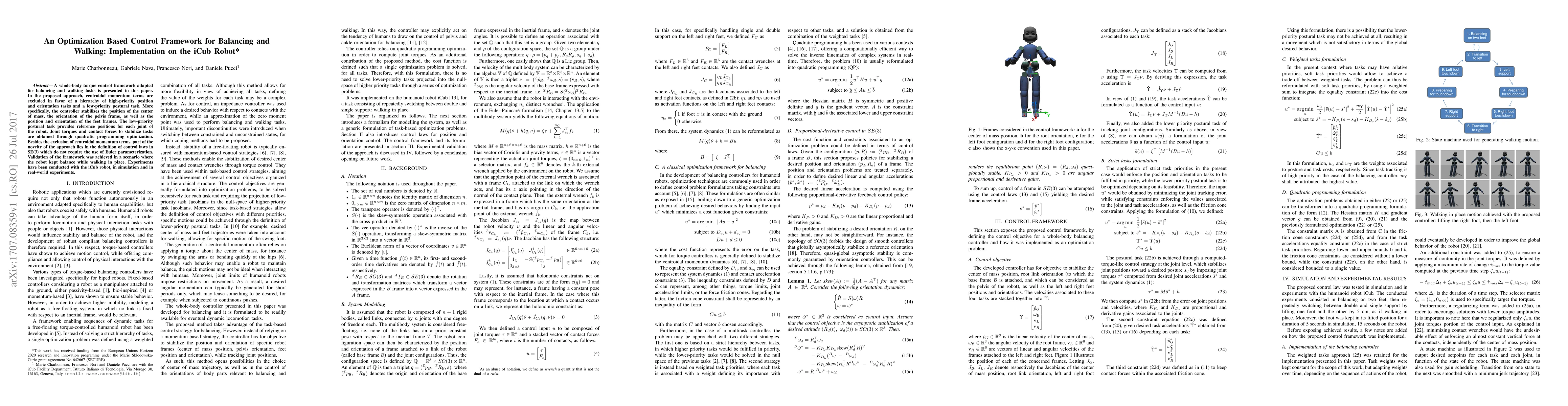 A new control framework is presented for balancing and walking tasks in robots, using quadratic programming optimization to stabilize joint torques and contact forces. The framework was successfully implemented on the iCub robot in simulation and real-world experiments.