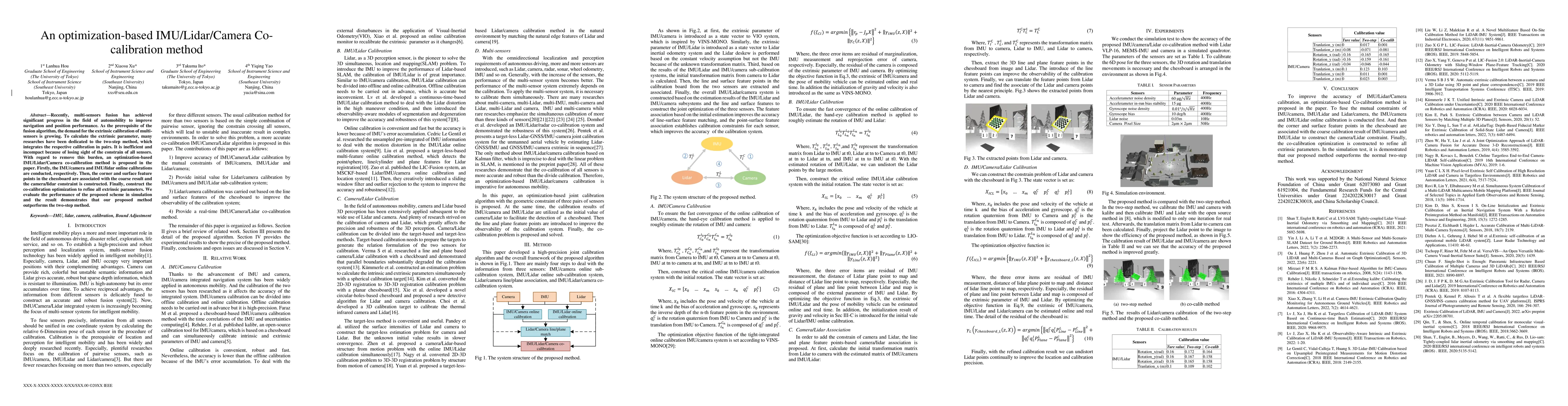 This paper proposes an optimization-based method for co-calibrating IMU, Lidar, and Camera sensors, aiming to improve multi-sensor fusion efficiency. The method refines extrinsic parameters through a single optimization process, outperforming the traditional two-step pairwise calibration approach.