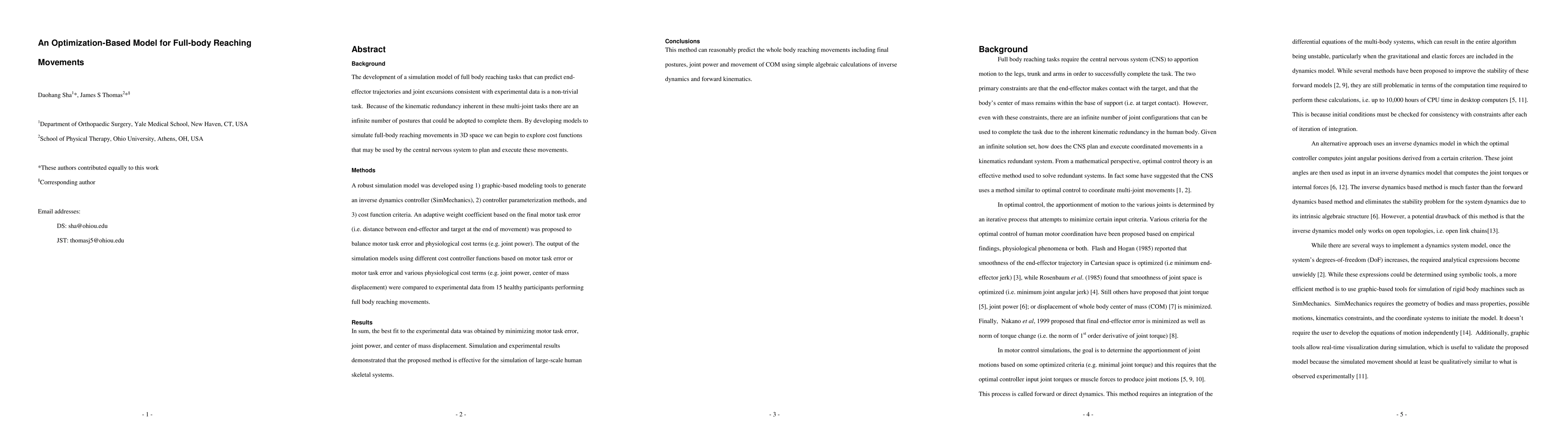 Background The development of a simulation model of full body reaching tasks that can predict endeffector trajectories and joint excursions consistent with experimental data is a non-trivial task. Because of the kinematic redundancy inherent in these multi-joint tasks there are an infinite number of postures that could be adopted to complete them. By developing models to simulate full-body reaching movements in 3D space we can begin to explore cost functions that may be used by the central nervous system to plan and execute these movements. Methods A robust simulation model was developed using 1) graphic-based modeling tools to generate an inverse dynamics controller (SimMechanics), 2) controller parameterization methods, and 3) cost function criteria. An adaptive weight coefficient based on the final motor task error (i.e. distance between end-effector and target at the end of movement) was proposed to balance motor task error and physiological cost terms (e.g. joint power). The output of the simulation models using different cost controller functions based on motor task error or motor task error and various physiological cost terms (e.g. joint power, center of mass displacement) were compared to experimental data from 15 healthy participants performing full body reaching movements. Results In sum, the best fit to the experimental data was obtained by minimizing motor task error, joint power, and center of mass displacement. Simulation and experimental results demonstrated that the proposed method is effective for the simulation of large-scale human skeletal systems. Conclusions This method can reasonably predict the whole body reaching movements including final postures, joint power and movement of COM using simple algebraic calculations of inverse dynamics and forward kinematics.