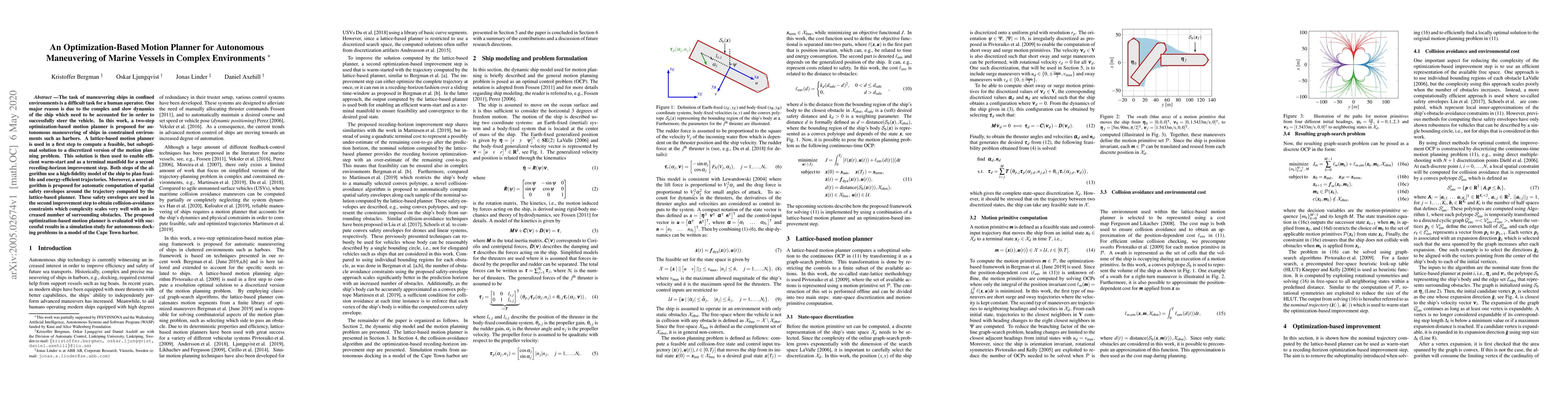 The task of maneuvering ships in confined environments is a difficult task for a human operator. One major reason is due to the complex and slow dynamics of the ship which need to be accounted for in order to successfully steer the vehicle. In this work, a two-step optimization-based motion planner is proposed for autonomous maneuvering of ships in constrained environments such as harbors. A lattice-based motion planner is used in a first step to compute a feasible, but suboptimal solution to a discretized version of the motion planning problem. This solution is then used to enable efficient warm-start and as a terminal manifold for a second receding-horizon improvement step. Both steps of the algorithm use a high-fidelity model of the ship to plan feasible and energy-efficient trajectories. Moreover, a novel algorithm is proposed for automatic computation of spatial safety envelopes around the trajectory computed by the lattice-based planner. These safety envelopes are used in the second improvement step to obtain collision-avoidance constraints which complexity scales very well with an increased number of surrounding obstacles. The proposed optimization-based motion planner is evaluated with successful results in a simulation study for autonomous docking problems in a model of the Cape Town~harbor.