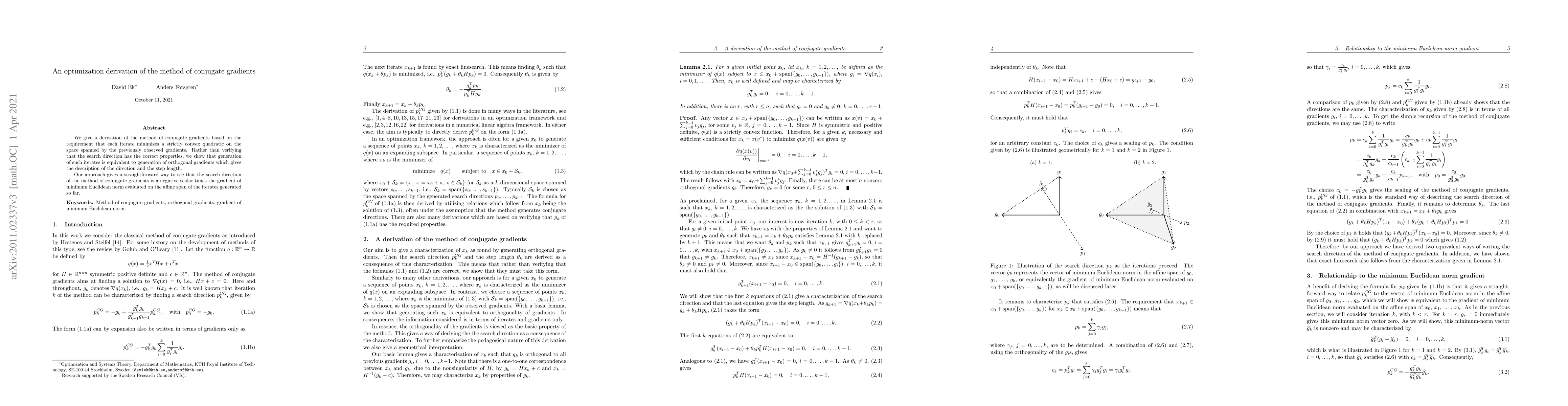 We give a derivation of the method of conjugate gradients based on the requirement that each iterate minimizes a strictly convex quadratic on the space spanned by the previously observed gradients. Rather than verifying that the search direction has the correct properties, we show that generation of such iterates is equivalent to generation of orthogonal gradients which gives the description of the direction and the step length. Our approach gives a straightforward way to see that the search direction of the method of conjugate gradients is a negative scalar times the gradient of minimum Euclidean norm evaluated on the affine span of the iterates generated so far.
