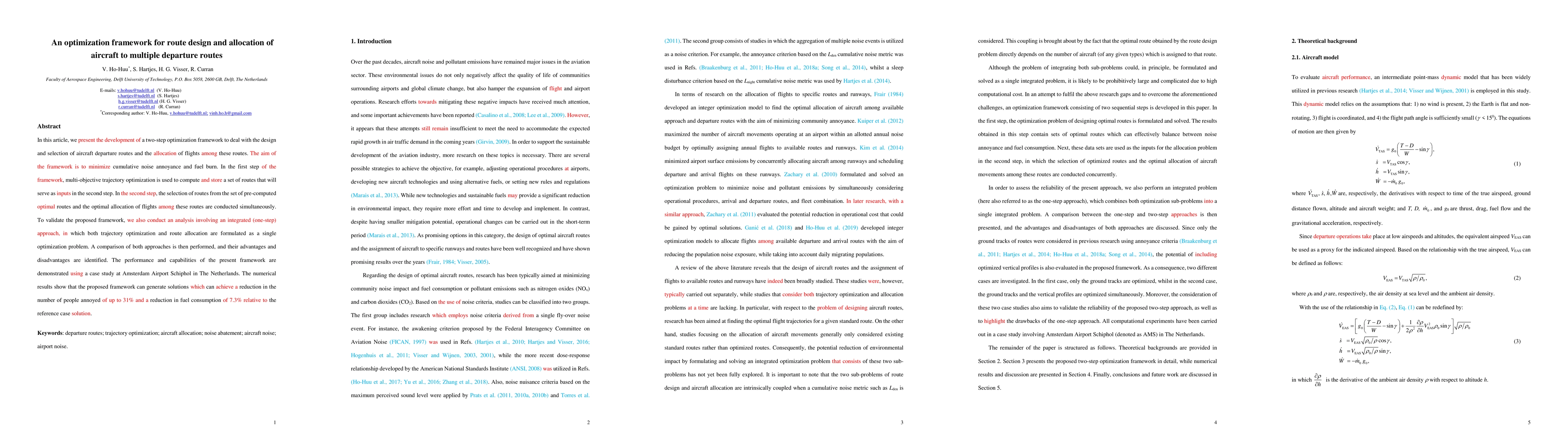 In this article, we present the development of a two-step optimization framework to deal with the design and selection of aircraft departure routes and the allocation of flights among these routes. The aim of the framework is to minimize cumulative noise annoyance and fuel burn. In the first step of the framework, multi-objective trajectory optimization is used to compute and store a set of routes that will serve as inputs in the second step. In the second step, the selection of routes from the set of pre-computed optimal routes and the optimal allocation of flights among these routes are conducted simultaneously. To validate the proposed framework, we also conduct an analysis involving an integrated (one-step) approach, in which both trajectory optimization and route allocation are formulated as a single optimization problem. A comparison of both approaches is then performed, and their advantages and disadvantages are identified. The performance and capabilities of the present framework are demonstrated using a case study at Amsterdam Airport Schiphol in The Netherlands. The numerical results show that the proposed framework can generate solutions which can achieve a reduction in the number of people annoyed of up to 31% and a reduction in fuel consumption of 7.3% relative to the reference case solution.