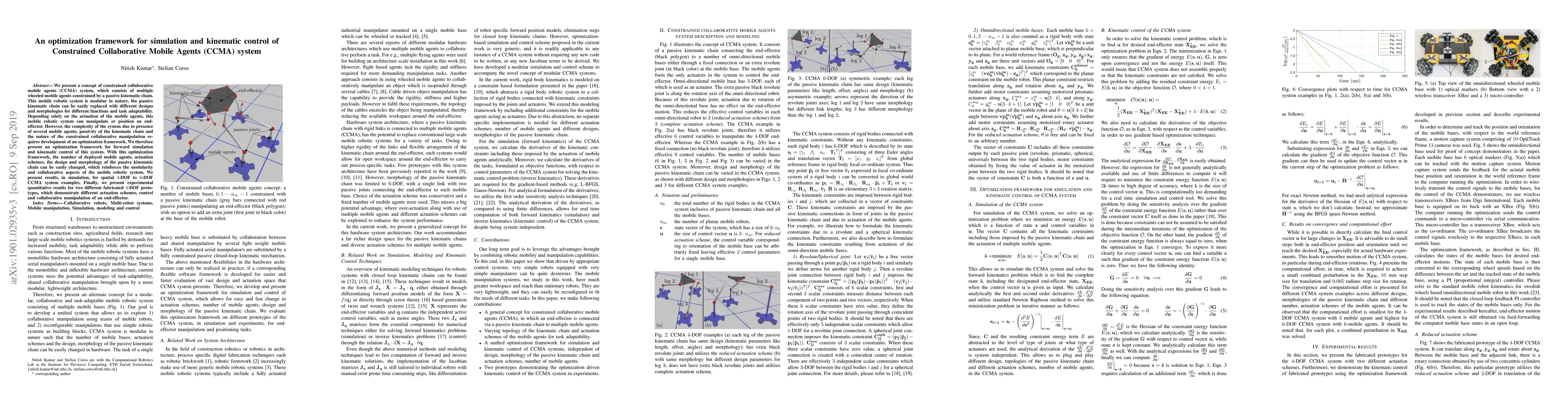 We present a concept of constrained collaborative mobile agents (CCMA) system, which consists of multiple wheeled mobile agents constrained by a passive kinematic chain. This mobile robotic system is modular in nature, the passive kinematic chain can be easily replaced with different designs and morphologies for different functions and task adaptability. Depending solely on the actuation of the mobile agents, this mobile robotic system can manipulate or position an end-effector. However, the complexity of the system due to presence of several mobile agents, passivity of the kinematic chain and the nature of the constrained collaborative manipulation requires development of an optimization framework. We therefore present an optimization framework for forward simulation and kinematic control of this system. With this optimization framework, the number of deployed mobile agents, actuation schemes, the design and morphology of the passive kinematic chain can be easily changed, which reinforces the modularity and collaborative aspects of the mobile robotic system. We present results, in simulation, for spatial 4-DOF to 6-DOF CCMA system examples. Finally, we present experimental quantitative results for two different fabricated 4-DOF prototypes, which demonstrate different actuation schemes, control and collaborative manipulation of an end-effector.