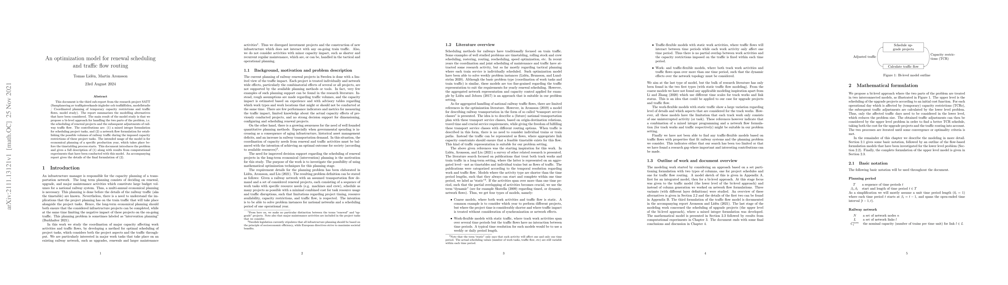 This research proposes a bi-level optimization model for coordinating renewal projects scheduling and railway traffic flow adjustments. It introduces a mixed integer formulation for task scheduling and a network flow formulation for traffic volume determination, aimed at economical planning in production years prior to timetabling.
