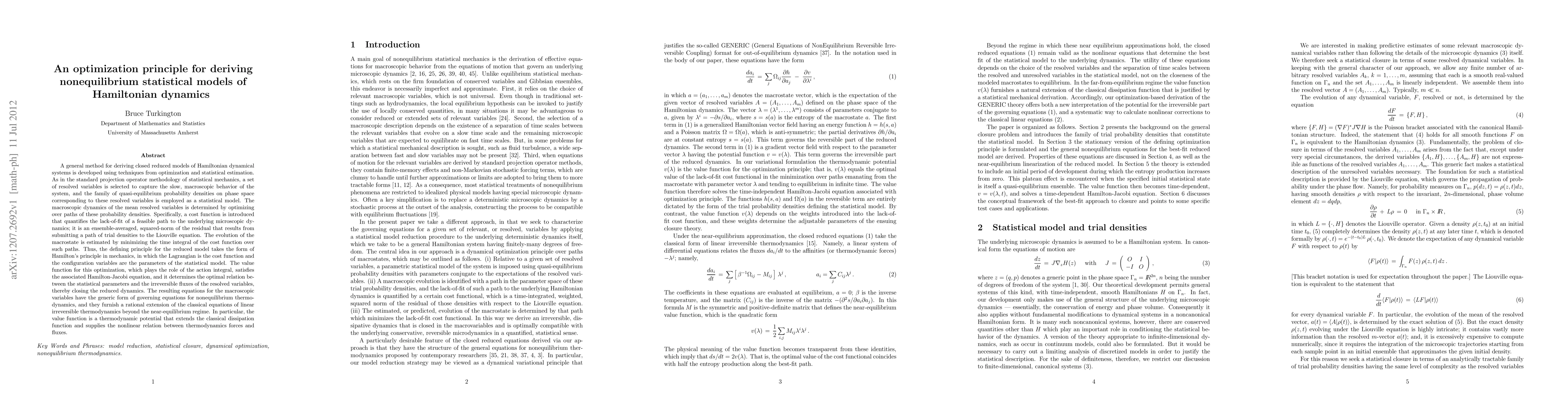 A general method for deriving closed reduced models of Hamiltonian dynamical systems is developed using techniques from optimization and statistical estimation. As in standard projection operator methods, a set of resolved variables is selected to capture the slow, macroscopic behavior of the system, and the family of quasi-equilibrium probability densities on phase space corresponding to these resolved variables is employed as a statistical model. The macroscopic dynamics of the mean resolved variables is determined by optimizing over paths of these probability densities. Specifically, a cost function is introduced that quantifies the lack-of-fit of such paths to the underlying microscopic dynamics; it is an ensemble-averaged, squared-norm of the residual that results from submitting a path of trial densities to the Liouville equation. The evolution of the macrostate is estimated by minimizing the time integral of the cost function. The value function for this optimization satisfies the associated Hamilton-Jacobi equation, and it determines the optimal relation between the statistical parameters and the irreversible fluxes of the resolved variables, thereby closing the reduced dynamics. The resulting equations for the macroscopic variables have the generic form of governing equations for nonequilibrium thermodynamics, and they furnish a rational extension of the classical equations of linear irreversible thermodynamics beyond the near-equilibrium regime. In particular, the value function is a thermodynamic potential that extends the classical dissipation function and supplies the nonlinear relation between thermodynamics forces and fluxes.