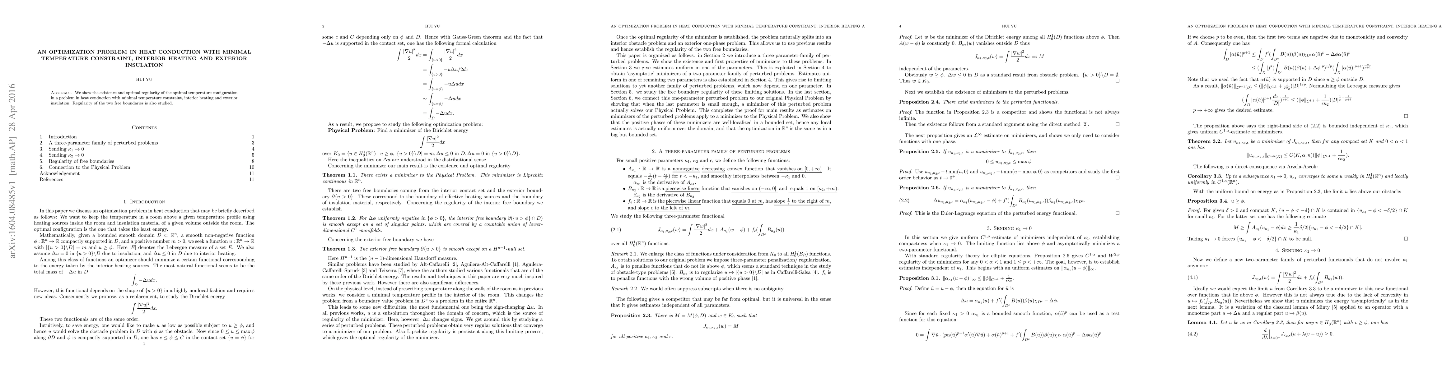 This research paper establishes the existence and optimal regularity of temperature configurations in a heat conduction problem with interior heating and exterior insulation, while minimizing temperature constraints.