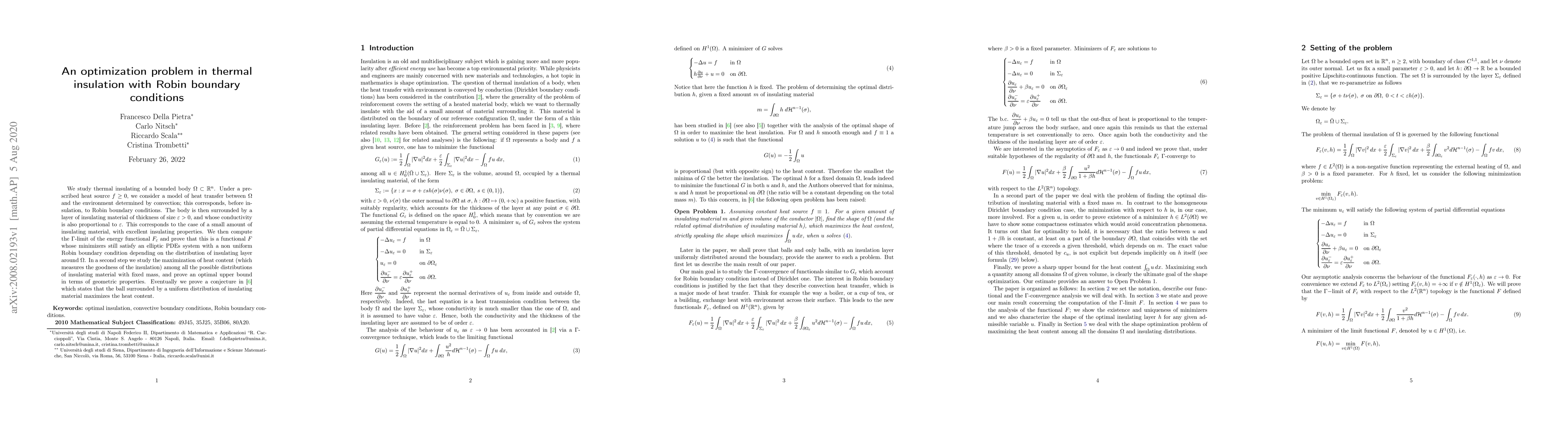 This paper investigates the optimization of thermal insulation for a bounded body under Robin boundary conditions, deriving the $\Gamma$-limit of an energy functional and proving that minimizers satisfy an elliptic PDE with a non-uniform Robin boundary condition. It also establishes an optimal upper bound for heat content maximization among insulating distributions and confirms that a uniform insulating layer around a ball maximizes heat content.