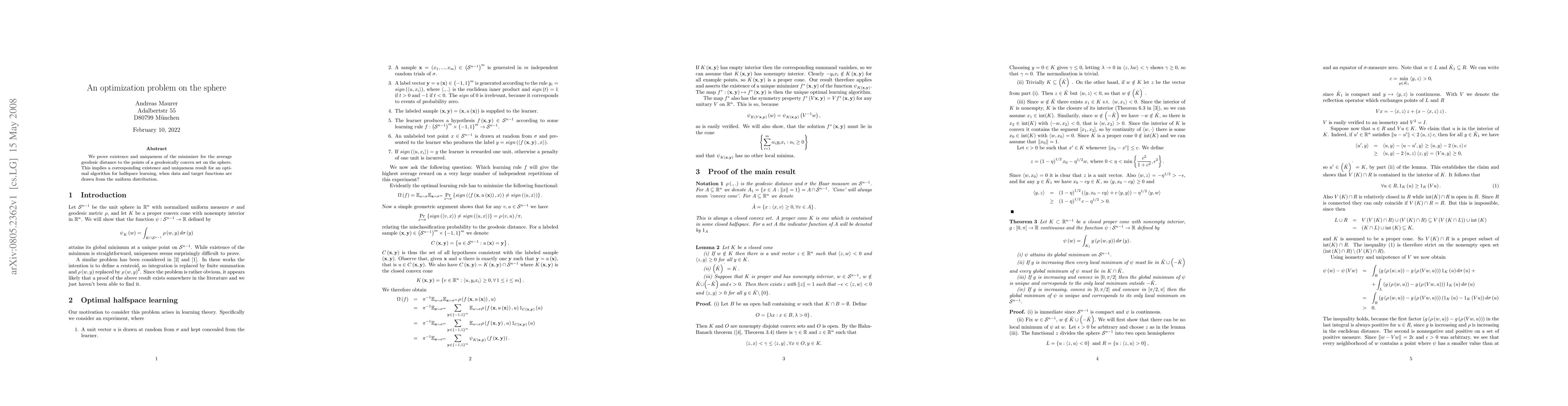 We prove existence and uniqueness of the minimizer for the average geodesic distance to the points of a geodesically convex set on the sphere. This implies a corresponding existence and uniqueness result for an optimal algorithm for halfspace learning, when data and target functions are drawn from the uniform distribution.