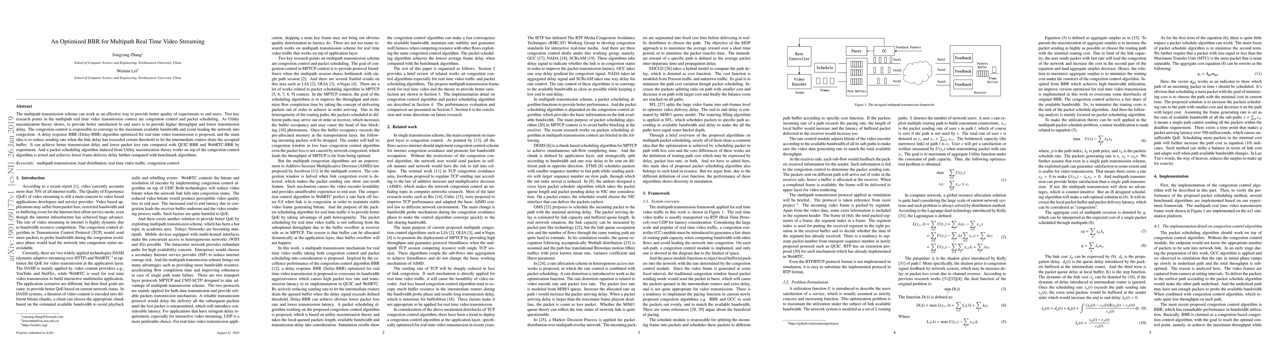 This paper proposes an optimized Delay-BBR congestion control algorithm for multipath real-time video streaming to enhance throughput and reduce transmission delay. Additionally, a utility maximization-based packet scheduling algorithm further improves frame delivery delay compared to existing benchmarks.