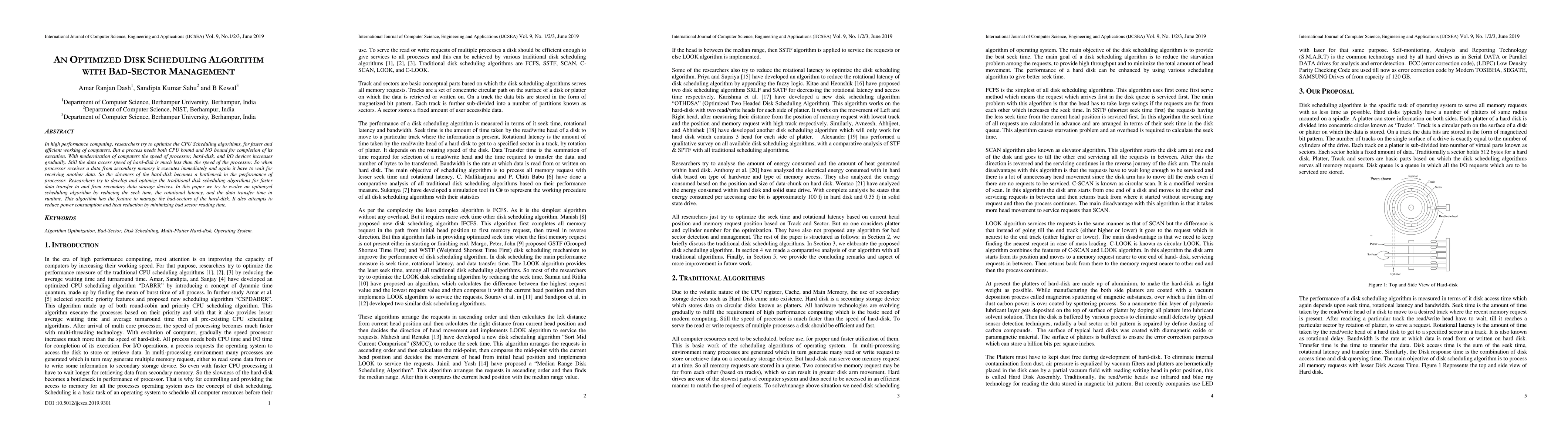 In high performance computing, researchers try to optimize the CPU Scheduling algorithms, for faster and efficient working of computers. But a process needs both CPU bound and I/O bound for completion of its execution. With modernization of computers the speed of processor, hard-disk, and I/O devices increases gradually. Still the data access speed of hard-disk is much less than the speed of the processor. So when processor receives a data from secondary memory it executes immediately and again it have to wait for receiving another data. So the slowness of the hard-disk becomes a bottleneck in the performance of processor. Researchers try to develop and optimize the traditional disk scheduling algorithms for faster data transfer to and from secondary data storage devices. In this paper we try to evolve an optimized scheduling algorithm by reducing the seek time, the rotational latency, and the data transfer time in runtime. This algorithm has the feature to manage the bad-sectors of the hard-disk. It also attempts to reduce power consumption and heat reduction by minimizing bad sector reading time.