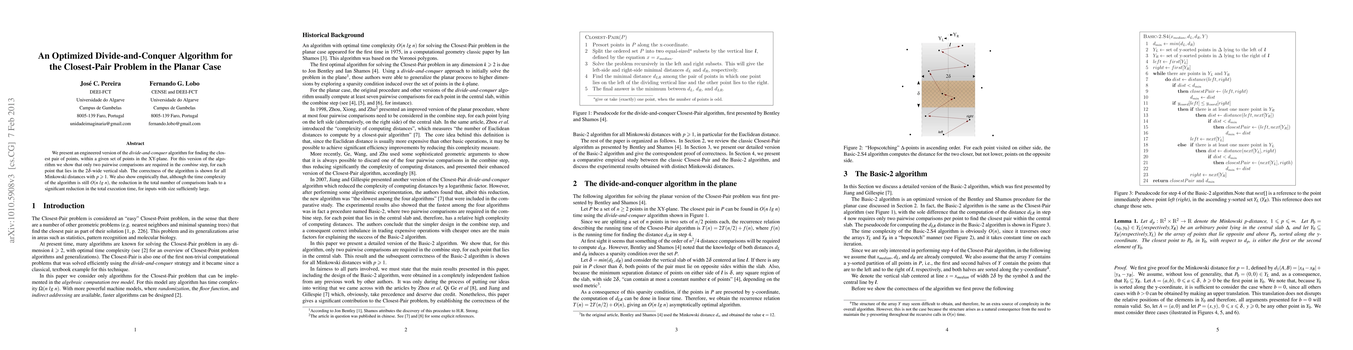 This paper presents an optimized divide-and-conquer algorithm for the planar closest-pair problem, requiring only two comparisons per point in the combine step. The algorithm maintains correctness for all Minkowski distances with p >= 1 and shows a significant reduction in execution time for large inputs despite maintaining O(n lg n) time complexity.