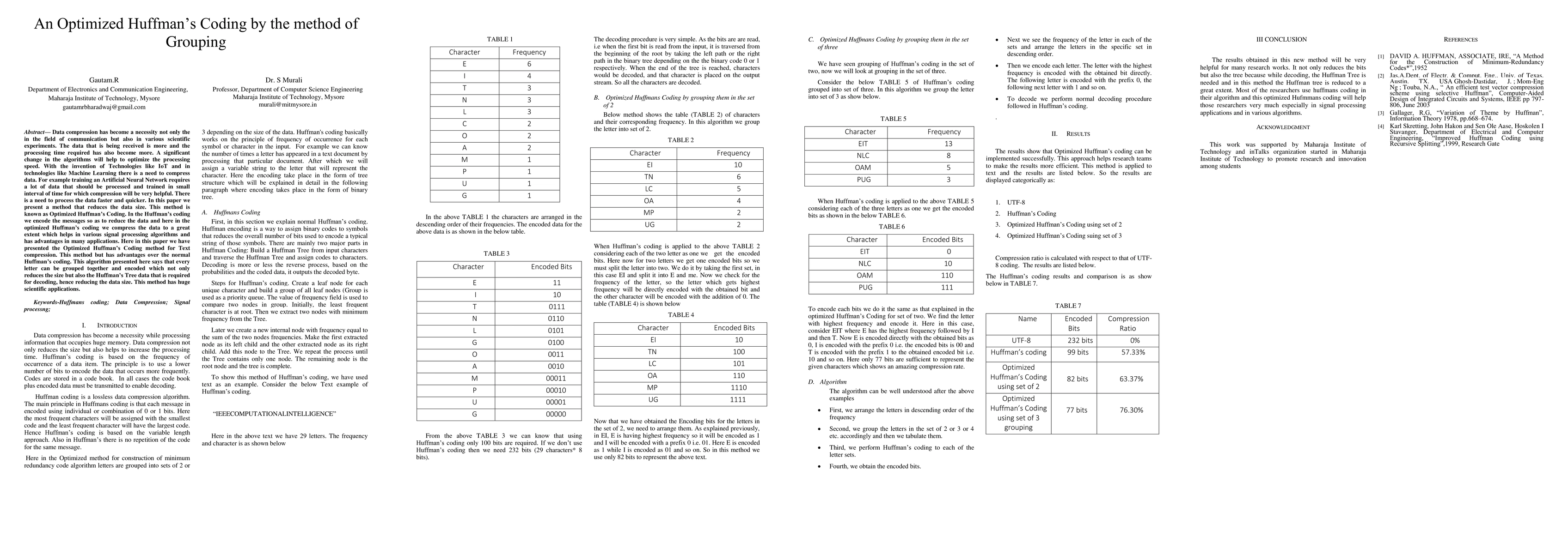 Optimized Huffmans Coding reduces data size by grouping letters together for efficient text compression, offering advantages in signal processing algorithms and various scientific applications.