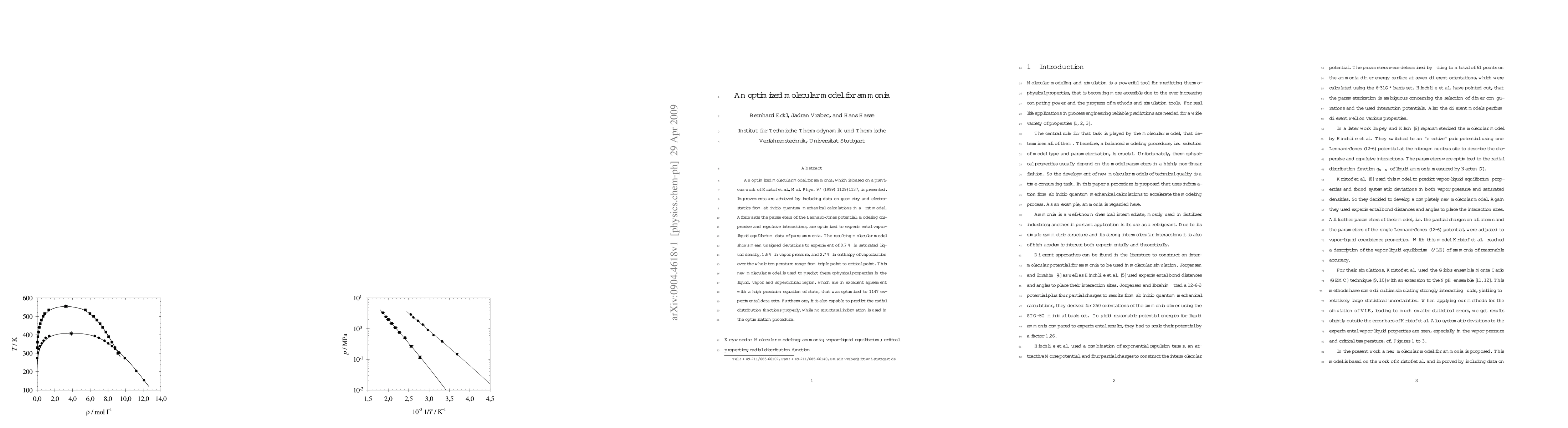 An optimized molecular model for ammonia, which is based on a previous work of Kristoef et al., Mol. Phys. 97 (1999) 1129--1137, is presented. Improvements are achieved by including data on geometry and electrostatics from quantum mechanical calculations in a first model. Afterwards the parameters of the Lennard-Jones potential, modeling dispersive and repulsive interactions, are optimized to experimental vapor-liquid equilibrium data of pure ammonia. The resulting molecular model shows mean unsigned deviations to experiment of 0.7% in saturated liquid density, 1.6% in vapor pressure, and 2.7% in enthalpy of vaporization over the whole temperature range from triple point to critical point. This new molecular model is used to predict thermophysical properties in the liquid, vapor and supercritical region, which are in excellent agreement with a high precision equation of state, that was optimized to 1147 experimental data sets. Furthermore, it is also capable to predict the radial distribution functions properly, while no structural information is used in the optimization procedure.