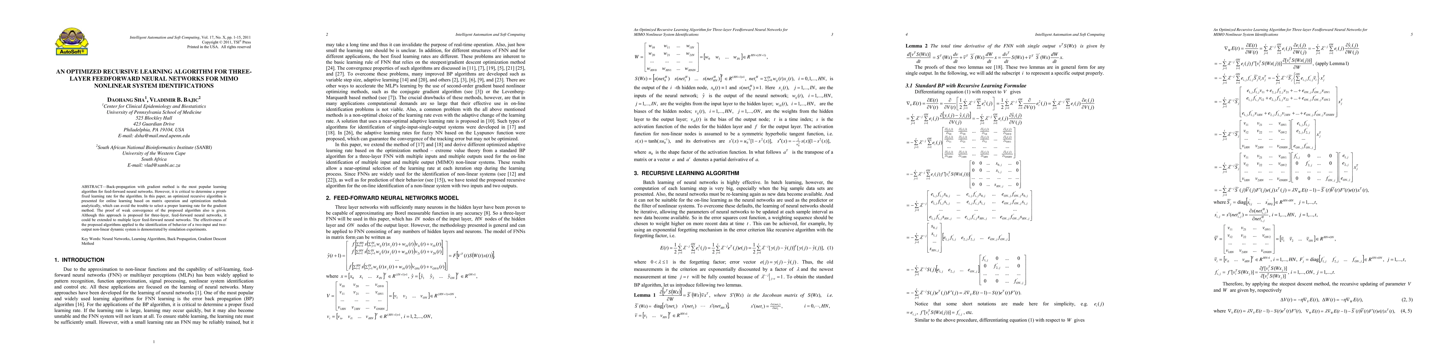 This paper proposes an optimized recursive learning algorithm for three-layer feedforward neural networks that eliminates the need for selecting a fixed learning rate, relying instead on matrix operations and optimization methods. The algorithm's weak convergence is proven, and its effectiveness is demonstrated through simulations for identifying the behavior of a two-input, two-output nonlinear dynamic system.