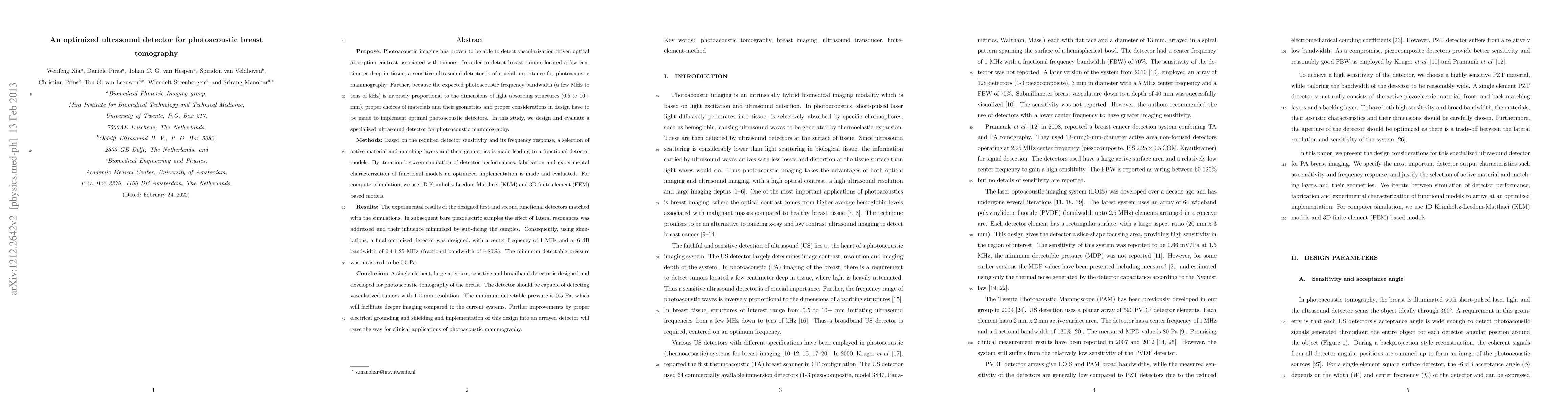 Researchers designed an optimized ultrasound detector for photoacoustic breast tomography, achieving a sensitivity of 0.5 Pa and resolving vascularized tumors at depths of 1-2 mm.