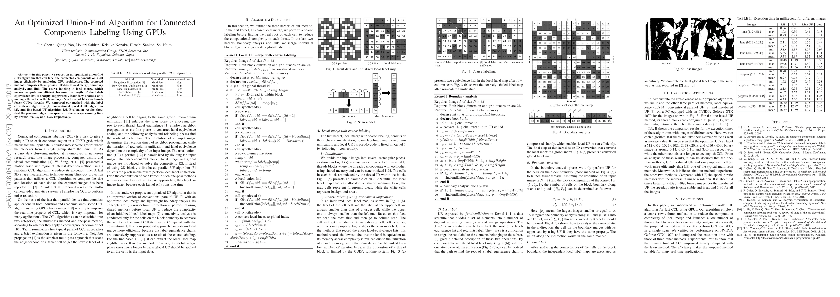 This paper presents an optimized union-find algorithm for labeling connected components on 2D images using GPU architecture, achieving over 1.3X speedup. The method includes UF-based local merge, boundary analysis, and link phases to reduce atomic operations and manage boundary pixels efficiently.