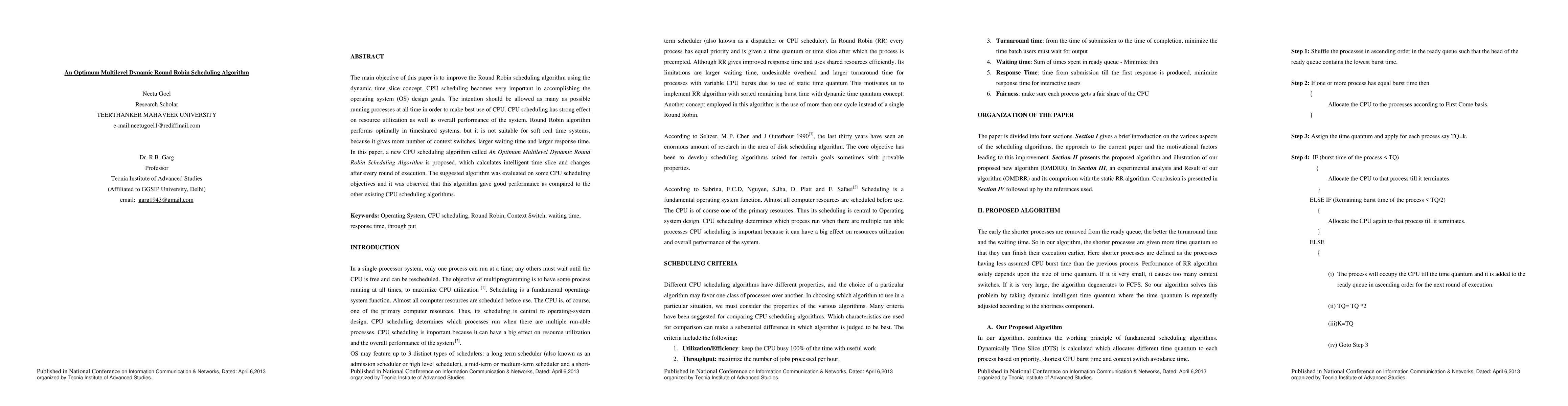 This paper proposes an Optimum Multilevel Dynamic Round Robin Scheduling Algorithm to enhance CPU scheduling efficiency by dynamically adjusting time slices, aiming to optimize resource utilization and performance in operating systems, outperforming traditional Round Robin in terms of reduced context switches and waiting times.