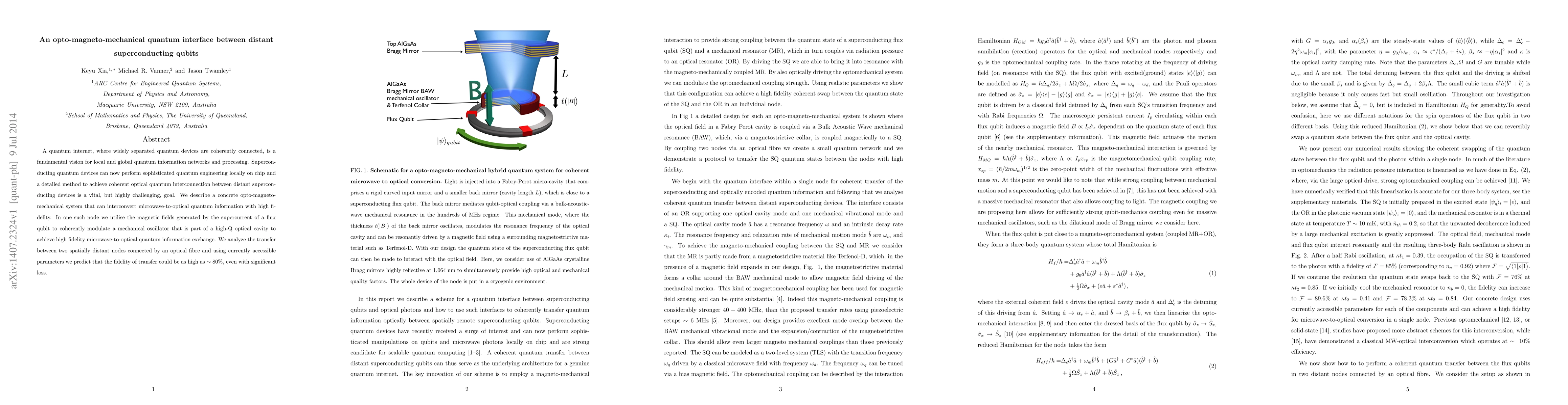 A quantum internet, where widely separated quantum devices are coherently connected, is a fundamental vision for local and global quantum information networks and processing. Superconducting quantum devices can now perform sophisticated quantum engineering locally on chip and a detailed method to achieve coherent optical quantum interconnection between distant superconducting devices is a vital, but highly challenging, goal. We describe a concrete opto-magneto-mechanical system that can interconvert microwave-to-optical quantum information with high fidelity. In one such node we utilise the magnetic fields generated by the supercurrent of a flux qubit to coherently modulate a mechanical oscillator that is part of a high-Q optical cavity to achieve high fidelity microwave-to-optical quantum information exchange. We analyze the transfer between two spatially distant nodes connected by an optical fibre and using currently accessible parameters we predict that the fidelity of transfer could be as high as $\sim 80\%$, even with significant loss.
