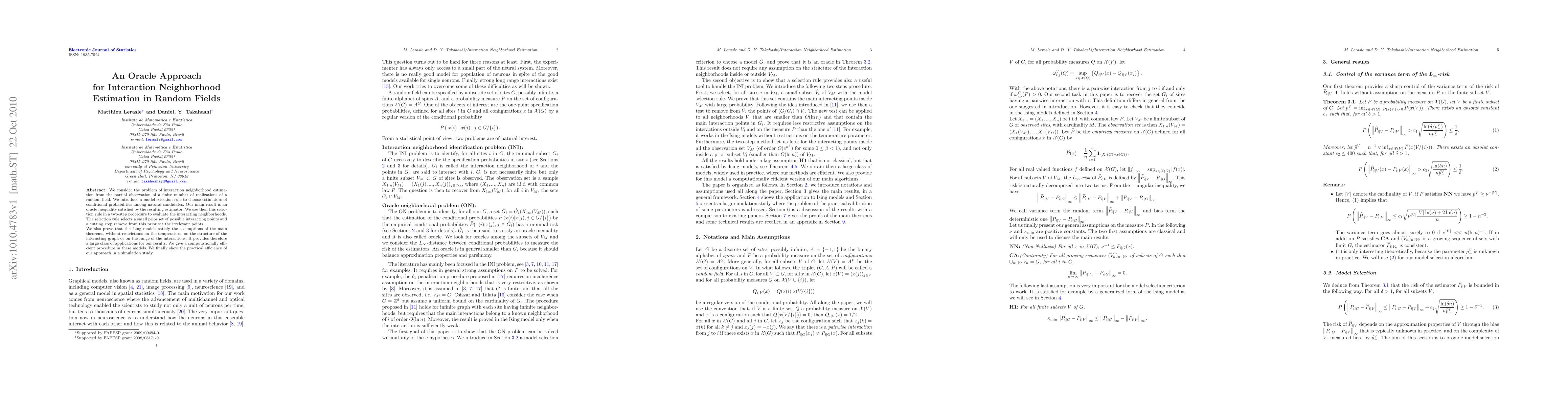 We consider the problem of interaction neighborhood estimation from the partial observation of a finite number of realizations of a random field. We introduce a model selection rule to choose estimators of conditional probabilities among natural candidates. Our main result is an oracle inequality satisfied by the resulting estimator. We use then this selection rule in a two-step procedure to evaluate the interacting neighborhoods. The selection rule selects a small prior set of possible interacting points and a cutting step remove from this prior set the irrelevant points. We also prove that the Ising models satisfy the assumptions of the main theorems, without restrictions on the temperature, on the structure of the interacting graph or on the range of the interactions. It provides therefore a large class of applications for our results. We give a computationally efficient procedure in these models. We finally show the practical efficiency of our approach in a simulation study.