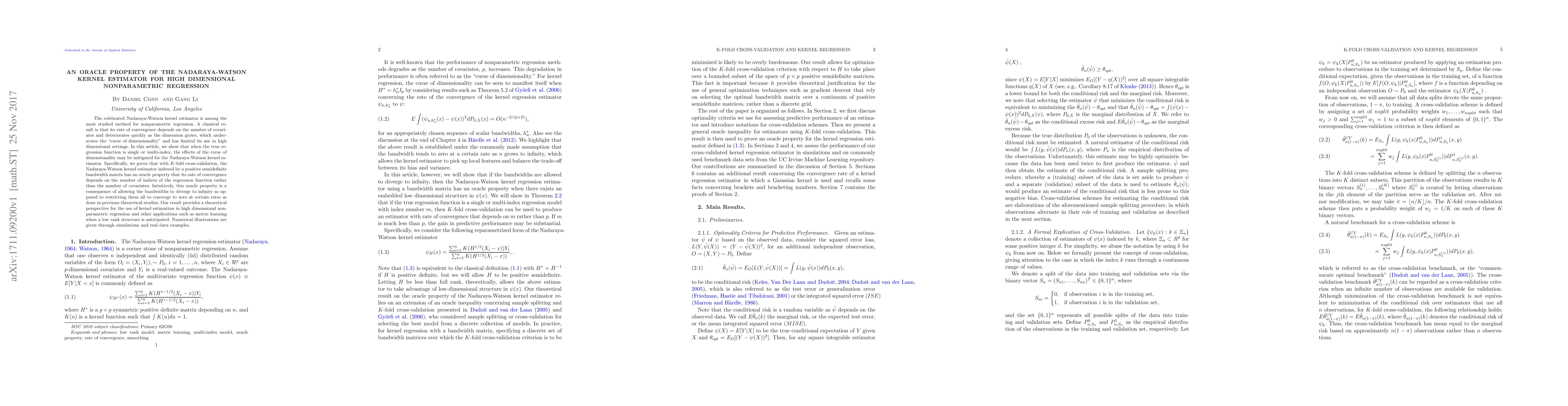 The celebrated Nadaraya-Watson kernel estimator is among the most studied method for nonparametric regression. A classical result is that its rate of convergence depends on the number of covariates and deteriorates quickly as the dimension grows, which underscores the "curse of dimensionality" and has limited its use in high dimensional settings. In this article, we show that when the true regression function is single or multi-index, the effects of the curse of dimensionality may be mitigated for the Nadaraya-Watson kernel estimator. Specifically, we prove that with $K$-fold cross-validation, the Nadaraya-Watson kernel estimator indexed by a positive semidefinite bandwidth matrix has an oracle property that its rate of convergence depends on the number of indices of the regression function rather than the number of covariates. Intuitively, this oracle property is a consequence of allowing the bandwidths to diverge to infinity as opposed to restricting them all to converge to zero at certain rates as done in previous theoretical studies. Our result provides a theoretical perspective for the use of kernel estimation in high dimensional nonparametric regression and other applications such as metric learning when a low rank structure is anticipated. Numerical illustrations are given through simulations and real data examples.